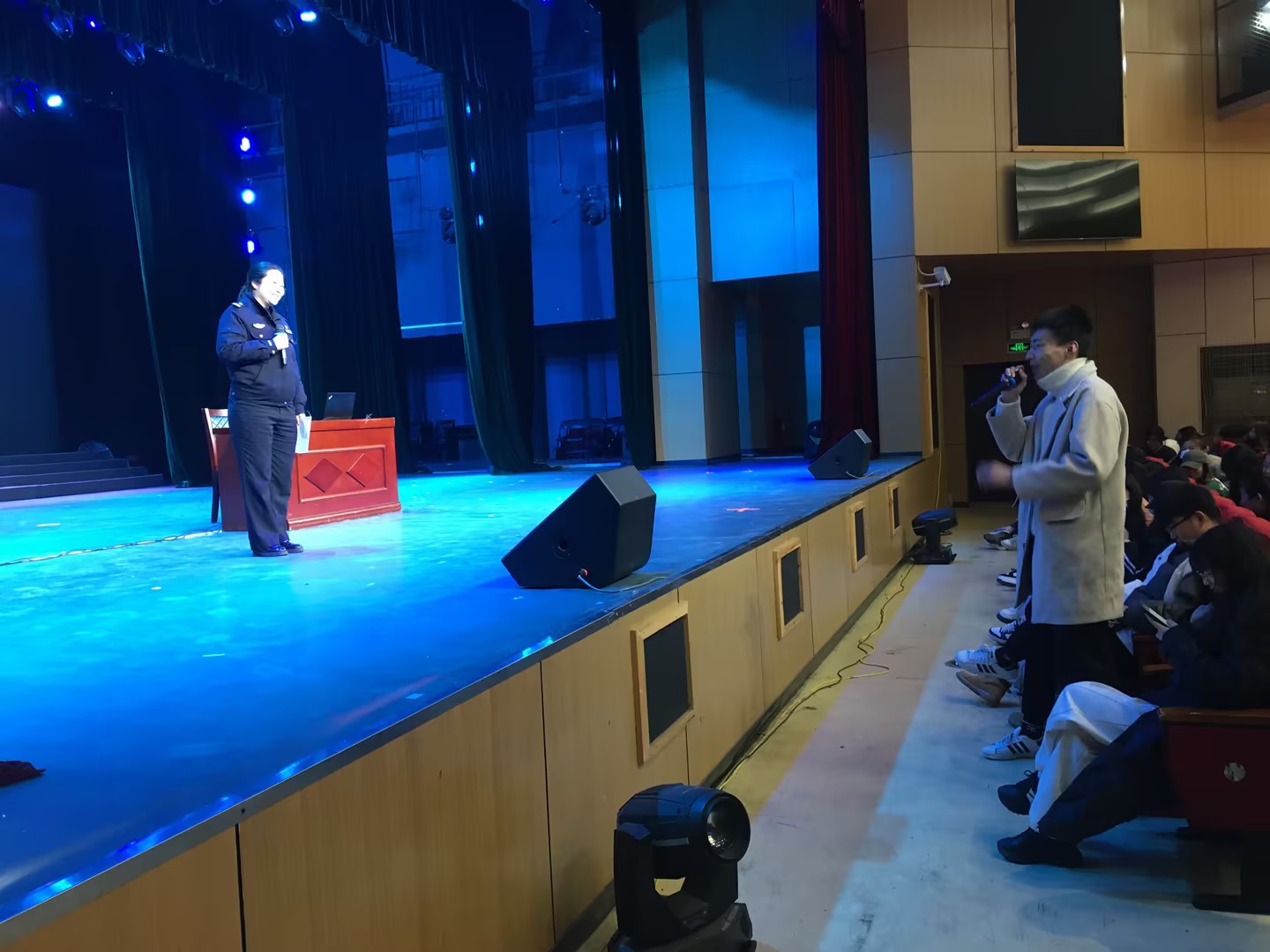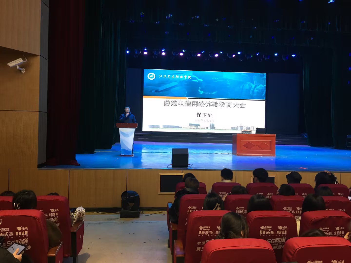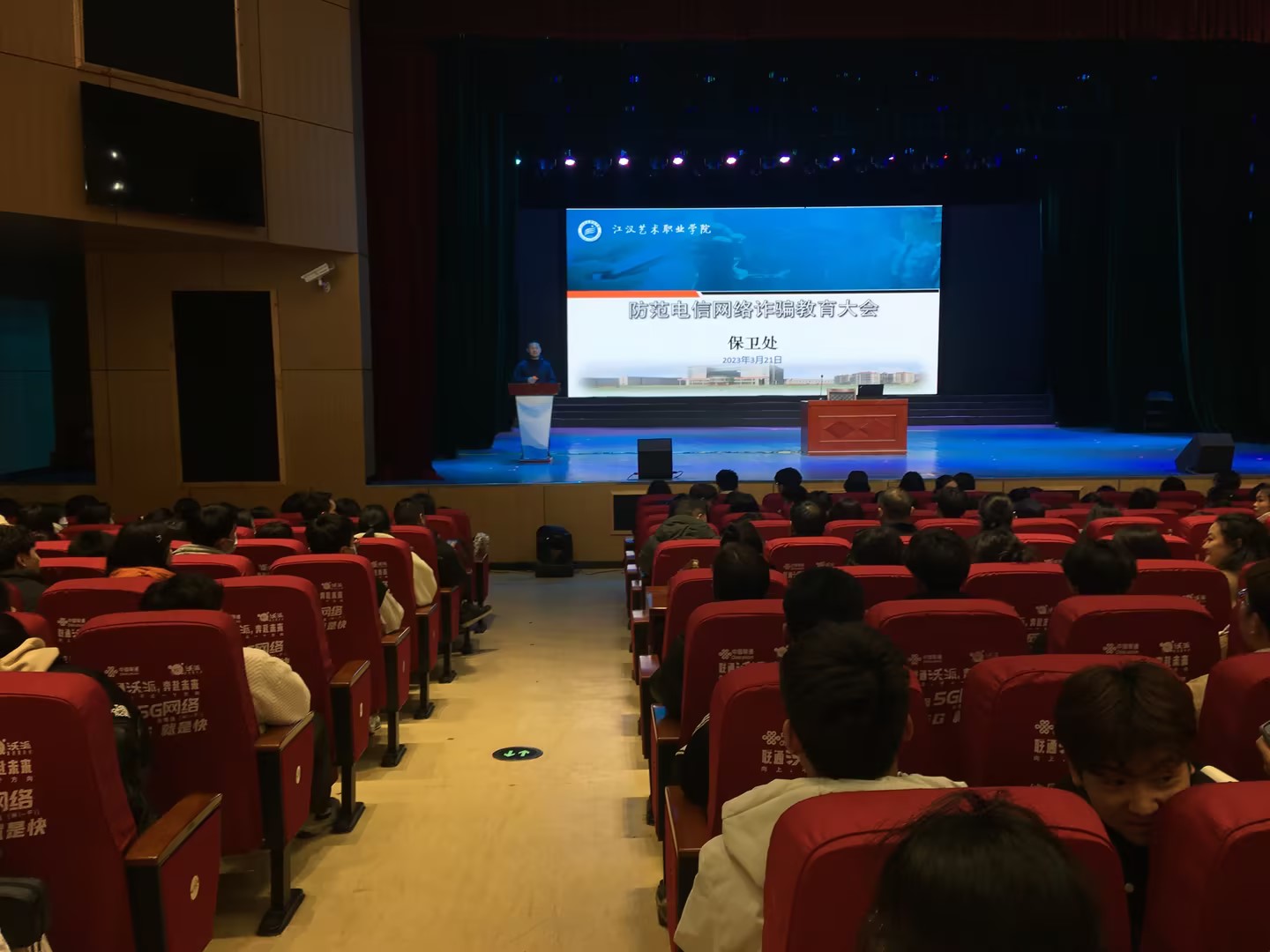 为提高我校学生的防骗意识,预防网络电信诈骗案件发生,2023年3月21日晚19:00,在我校风华楼剧场组织学生开展了防范电信网络诈骗教育大会,邀请了潜江市公安局刑侦支队大队长熊力、潜江市公安局园林派出所城东警队副队长王功伟、潜江市公安局园林派出所宣传委员朱晨洁来校讲座,工会主席李伟、各院部负责人及学工领导、学生代表共600多人参加了教育大会。