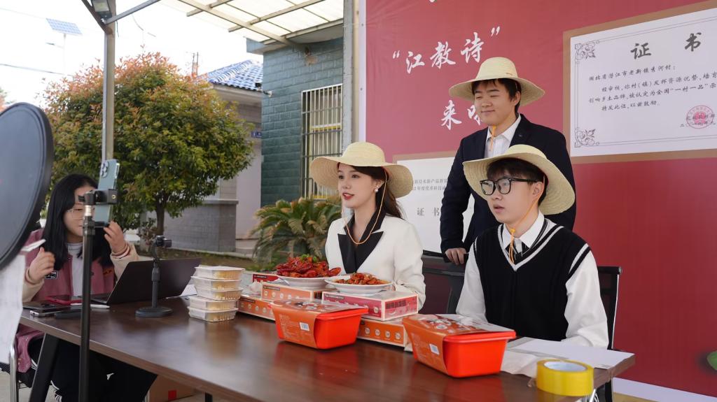 在该镇秀河村的助农直播间里,师生们通过直播平台,向全国网友推介小龙虾产品、自然风光和文化旅游资源。主播、助播、运营等岗位的同学们各司其职,整个直播过程有条不紊。