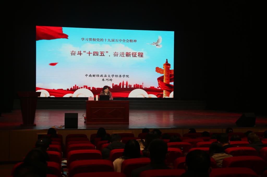 会上,朱巧玲教授以丰富详实的案例、通俗易懂的语言,从党的十九届五中全会的历史性意义,2035年远景目标和“十四五”时期我国发展的指导方针、主要目标、重点任务,牢牢把握构建新发展格局的战略构想和重要着力点,坚持党的全面领导、动员各方面力量为实现“十四五”规划和2035年远景目标而团结奋斗等方面,对全会精神进行了系统解读。
