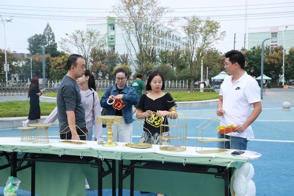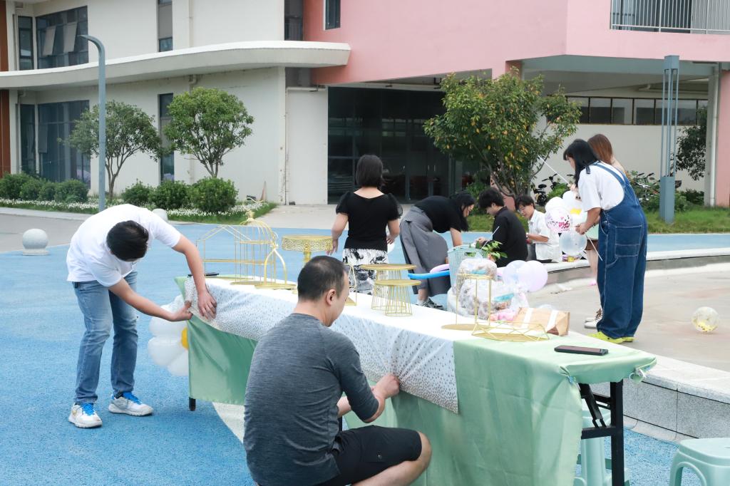 活动开始前,现场师生争分夺秒地对场地进行装饰。吹气球、绑气球、铺桌布、摆月饼、挂灯串,所有装饰工作都在有条不紊地进行着。