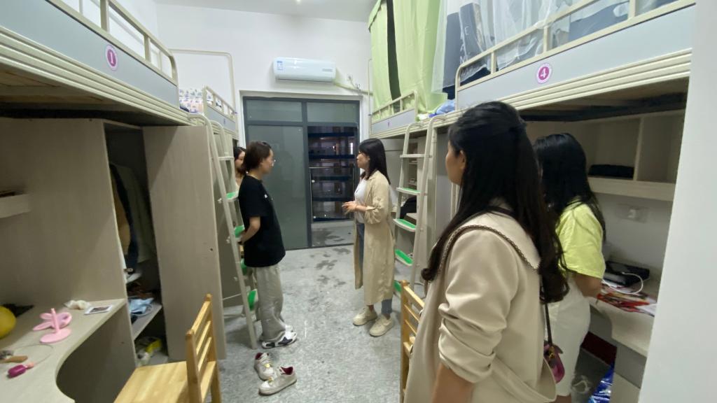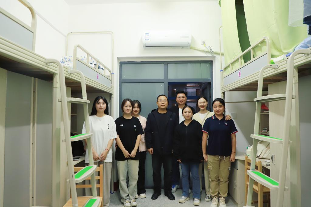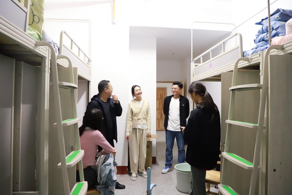 学校高度重视学生寝室建设情况,希望创建出学生舒心、家长放心、学校安心的寝室环境。领导老师辅导员们深入新生宿舍,与同学们情切地交谈,遣散了新同学们离家的紧张与家长的担忧,扫净疲惫,温暖护航。