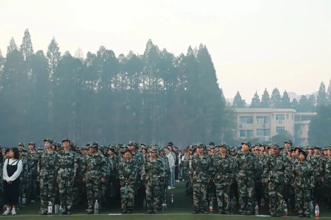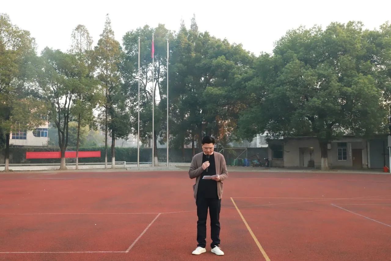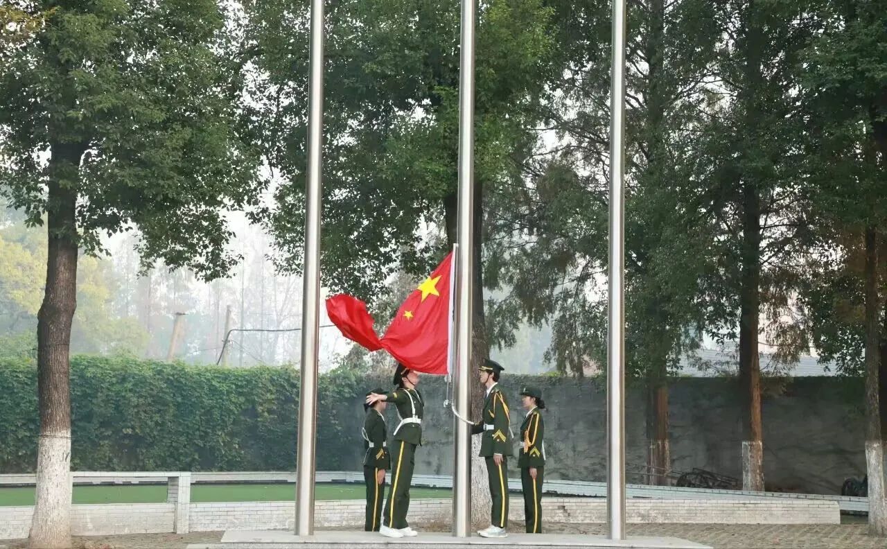 迎着朝阳,国旗护卫队迈着铿锵有力、整齐划一的步伐护送五星红旗至升旗台。伴随着激昂雄壮的《义勇军进行曲》,五星红旗在晨光中冉冉升起,全体师生行注目礼,奏唱国歌,为祖国献上最真挚的祝福。