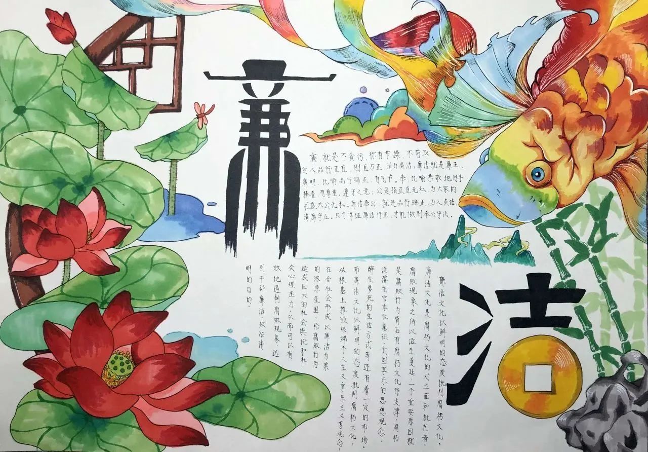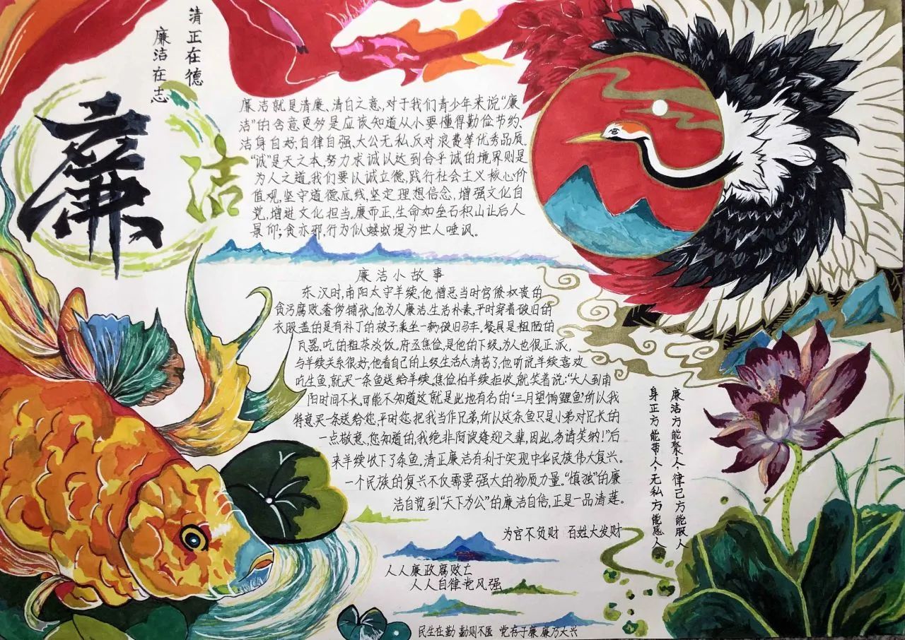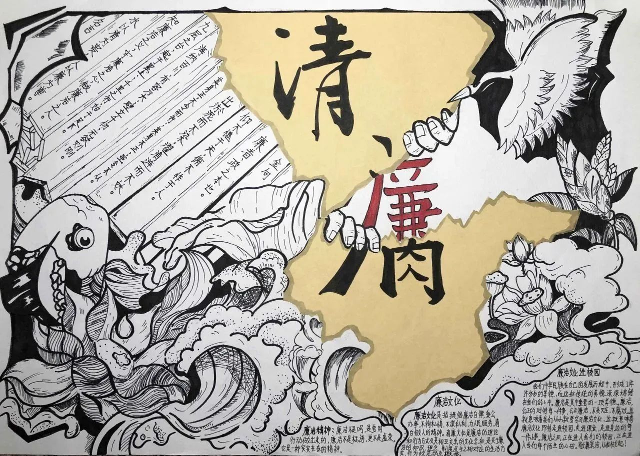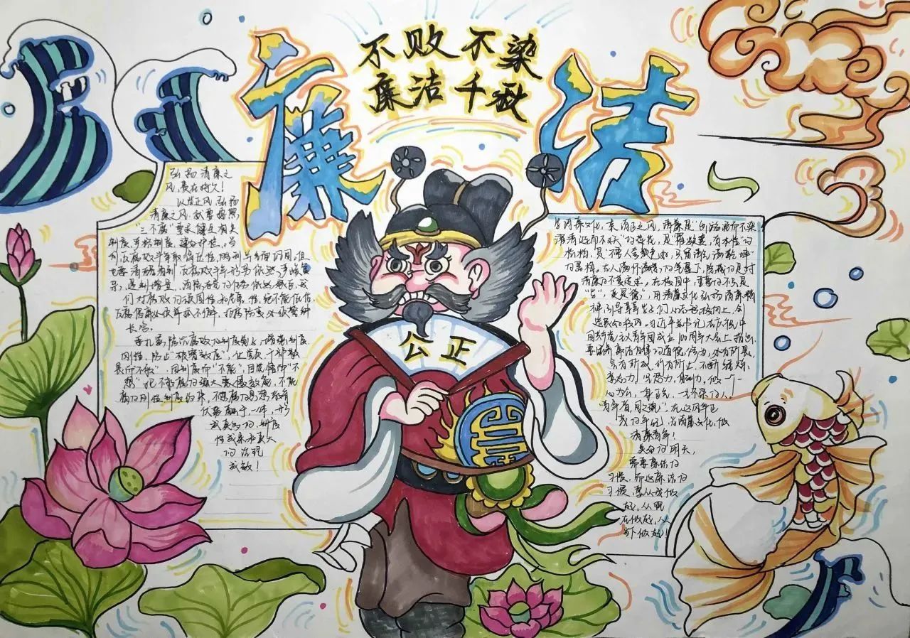 此次活动将手抄报制作与廉洁文化融入到同学们的学习生活中,同学们通过发挥自己的创造力和想象力,在作品形式、图文色彩、构思布局等方面充分展现了自己独特的审美和创意。作为新时代的青年,我们应将“廉”的种子在心中播撒,争做清廉文化建设的参与者与传承者,一同携手,让廉洁之风吹满校园。