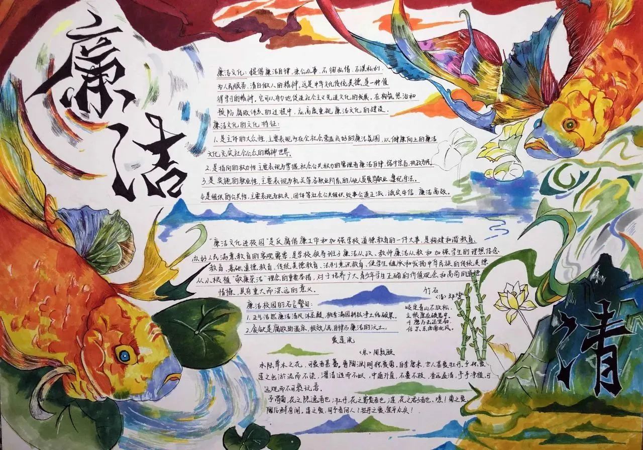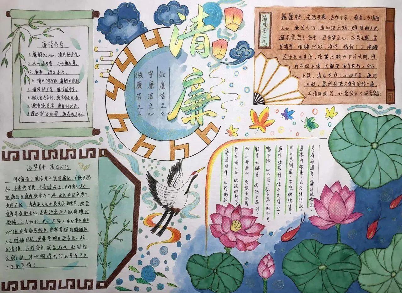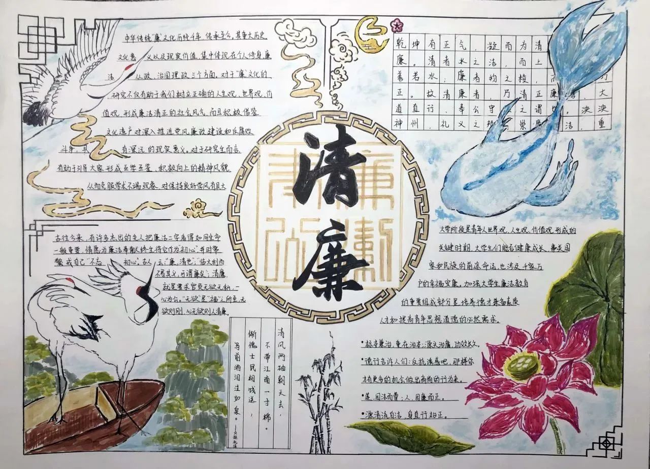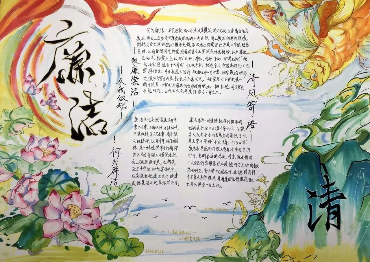 此次活动将手抄报制作与廉洁文化融入到同学们的学习生活中,同学们通过发挥自己的创造力和想象力,在作品形式、图文色彩、构思布局等方面充分展现了自己独特的审美和创意。作为新时代的青年,我们应将“廉”的种子在心中播撒,争做清廉文化建设的参与者与传承者,一同携手,让廉洁之风吹满校园。