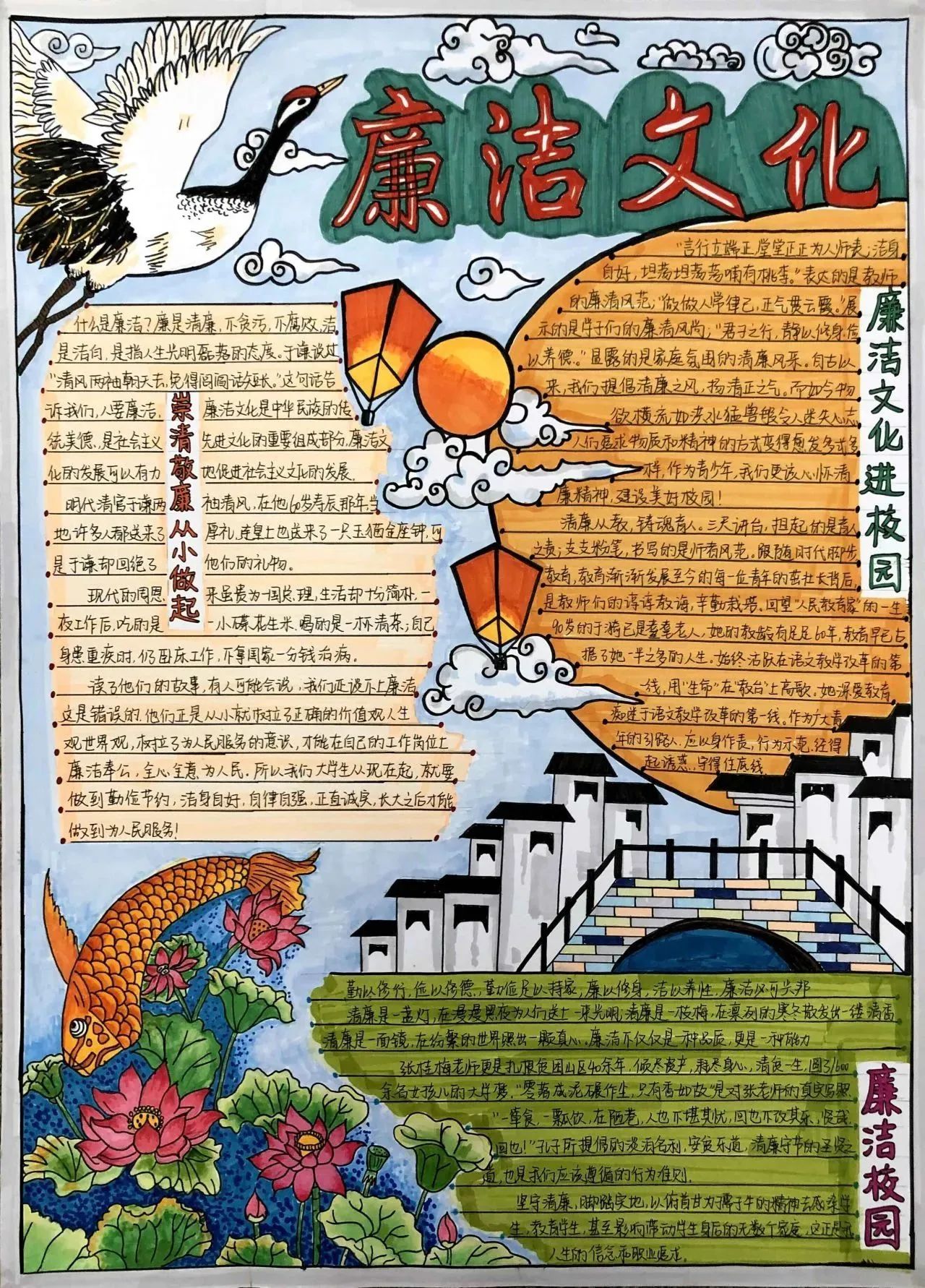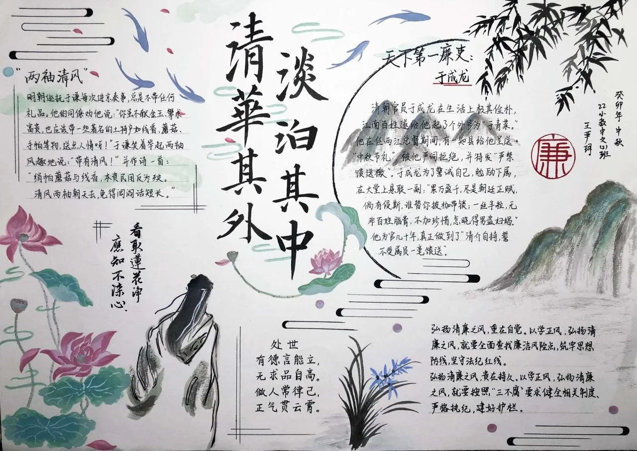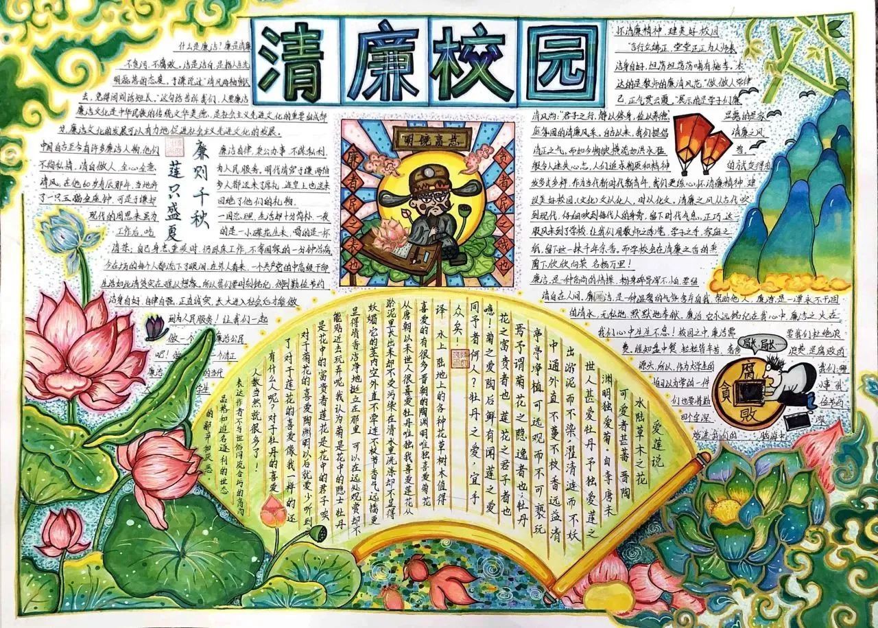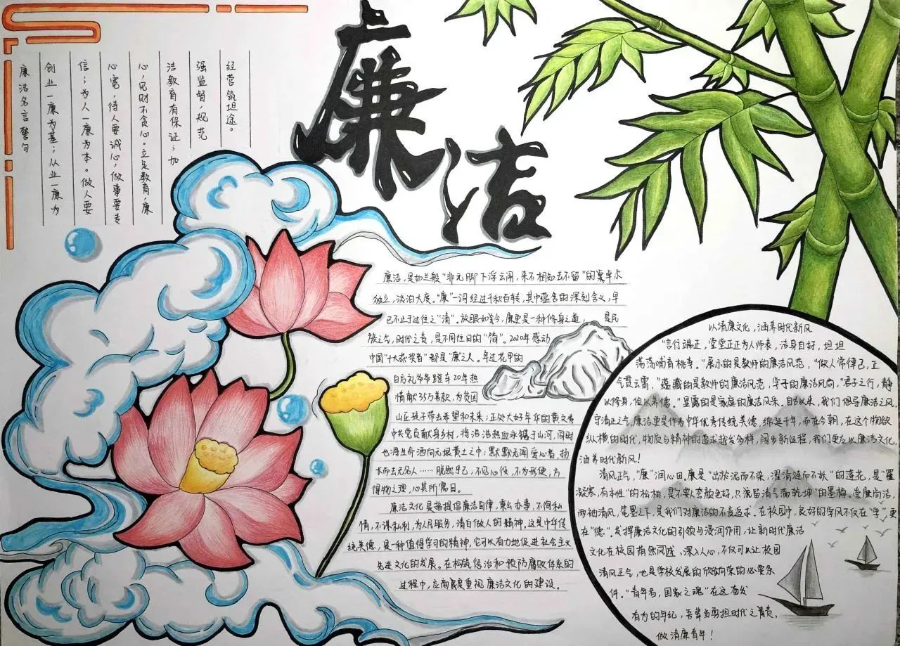 此次活动将手抄报制作与廉洁文化融入到同学们的学习生活中,同学们通过发挥自己的创造力和想象力,在作品形式、图文色彩、构思布局等方面充分展现了自己独特的审美和创意。作为新时代的青年,我们应将“廉”的种子在心中播撒,争做清廉文化建设的参与者与传承者,一同携手,让廉洁之风吹满校园。