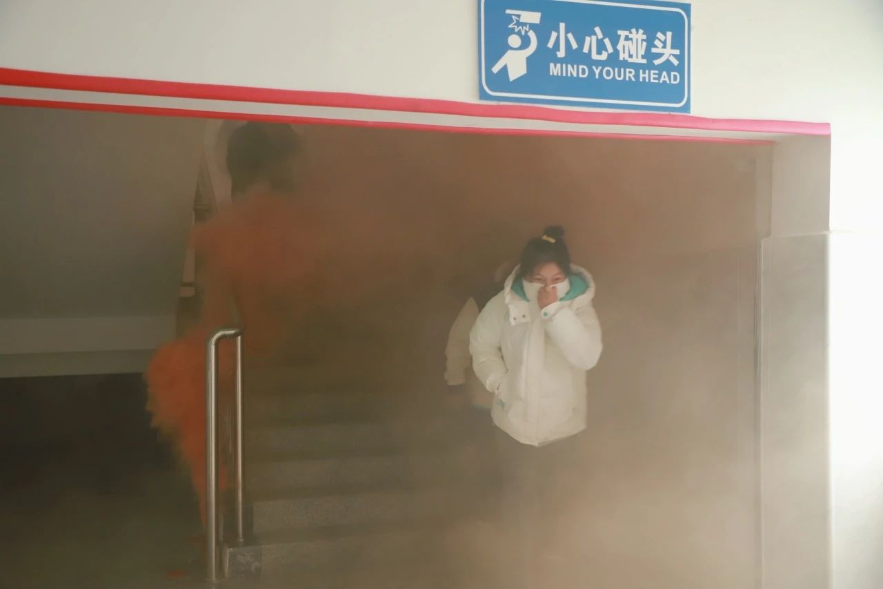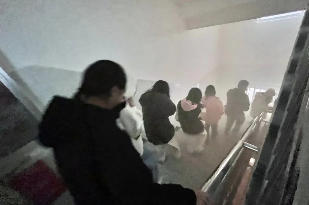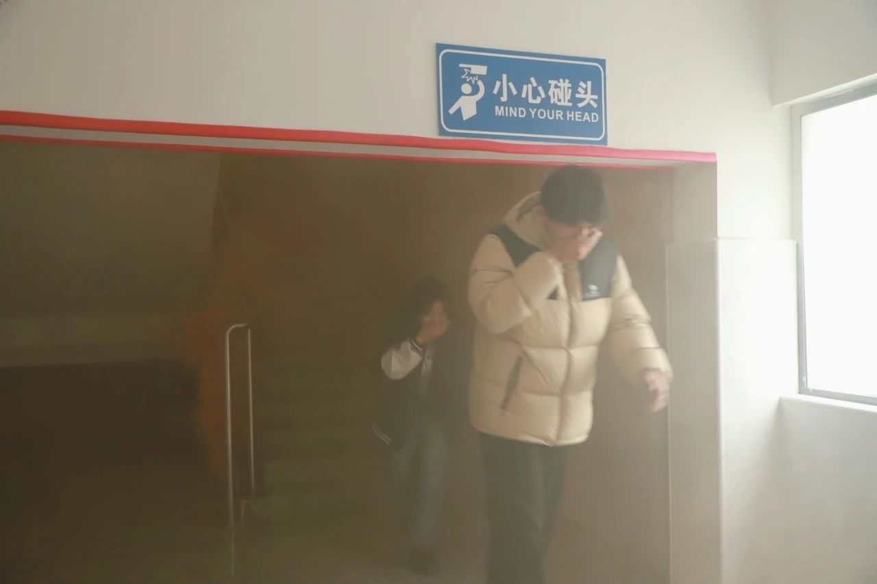 随后组织了一次室内消防演练,当紧急警报响起时,各辅导员、楼层指挥教师迅速各就各位,指挥学生进行逃离现场。同学们按照要求,用手捂住口鼻并弯着腰,按照规划好的逃生路线有序撤离,到安全点集合。