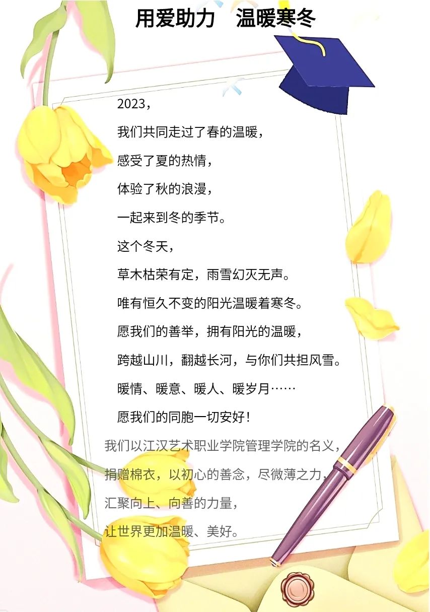 灾难无情,人间有爱。为让受灾地区的同胞们能够温暖过冬,我院呼吁家中有闲置的长款棉衣、羽绒服、防寒保暖设施等救灾物资的老师们尽绵薄之力,开展物资捐赠活动,传递管院的爱。