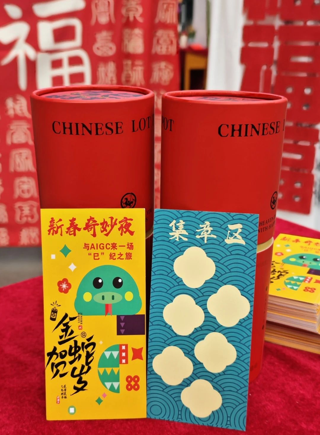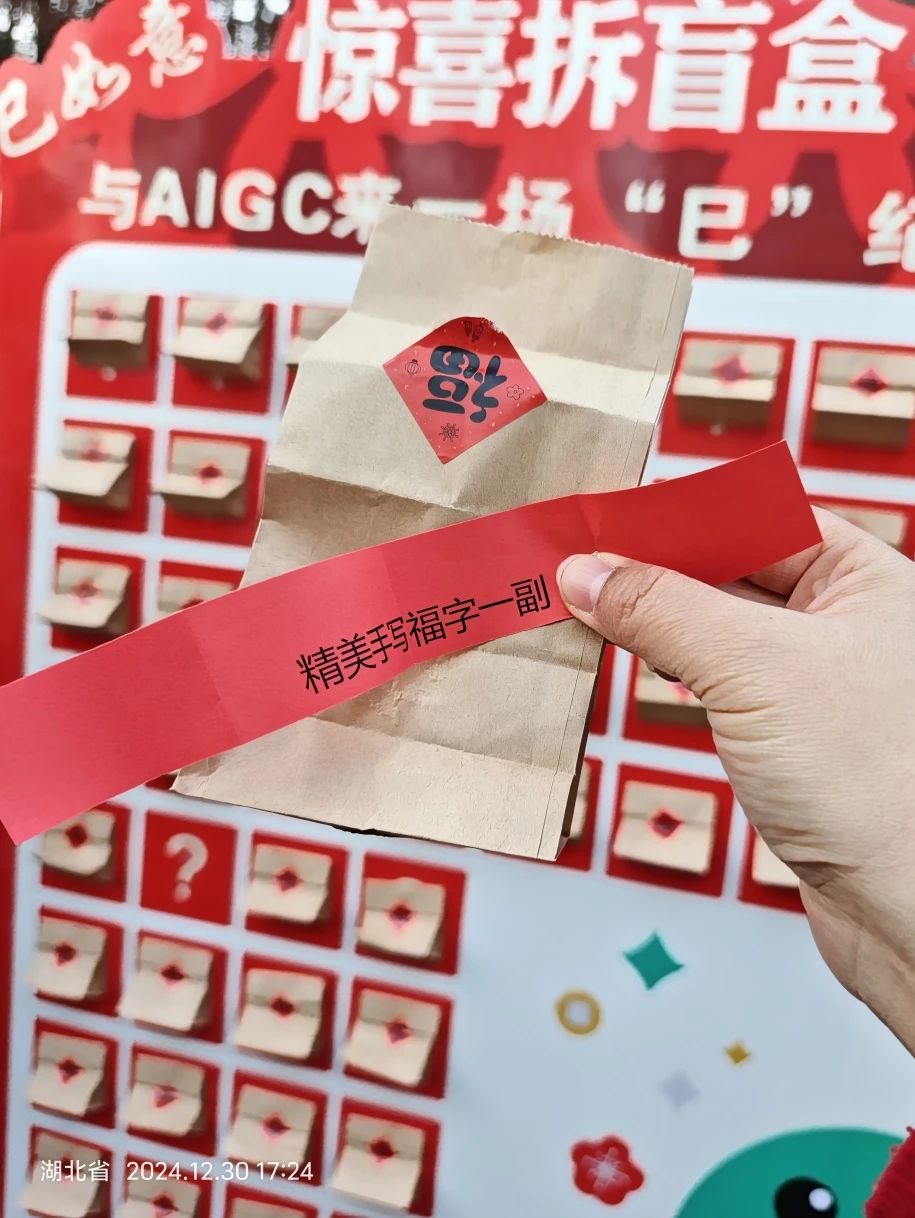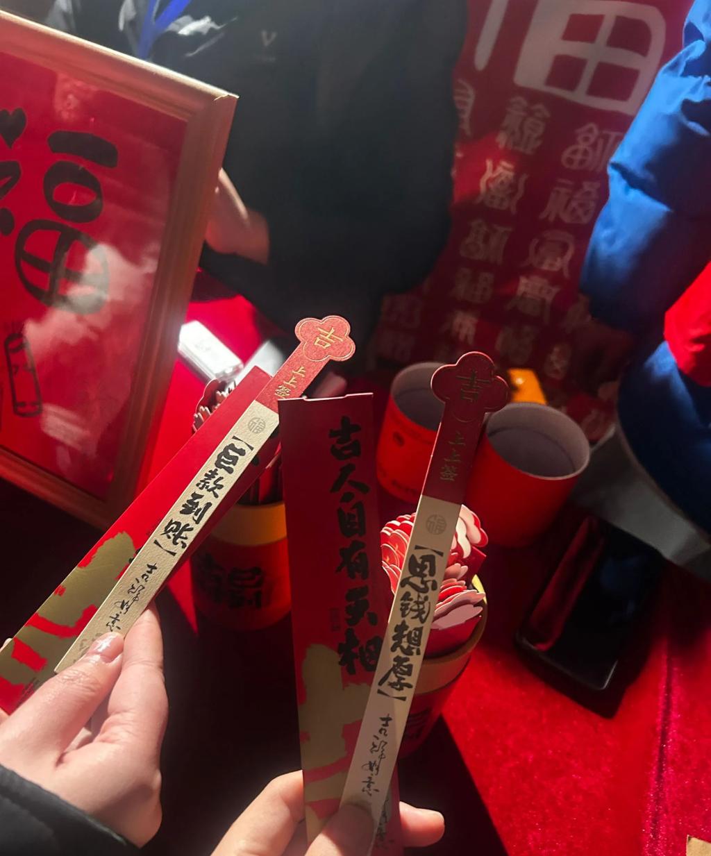 这些手工作品包括手工书法“福”字、手工 DIY 拓印画、手工书法藏头诗、手工书法对联以及现场教一项 AI 魔法技能,让参与者挑选出一份与自己最有缘分的新春礼物,将这份独特的喜悦悉心珍藏。