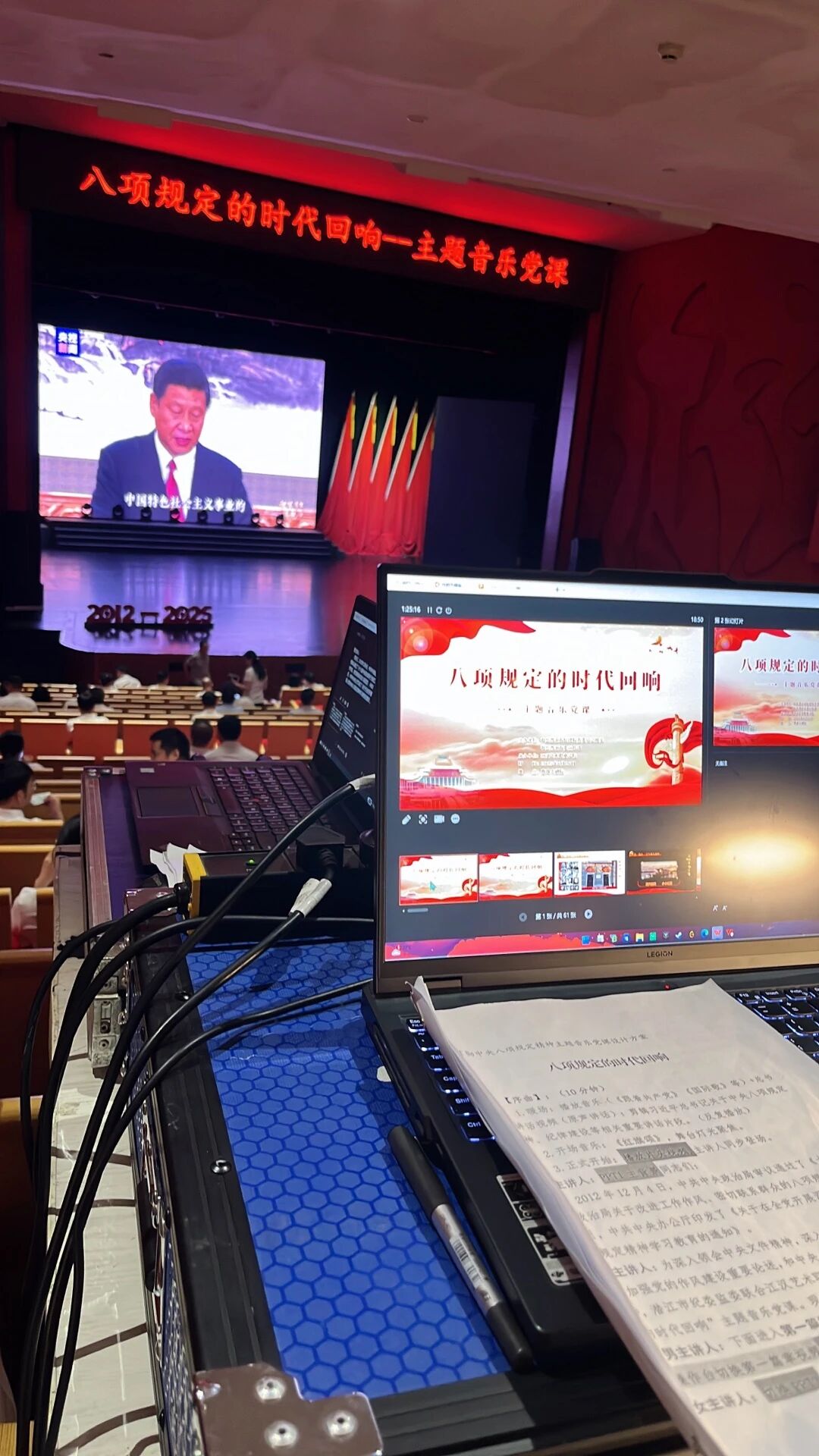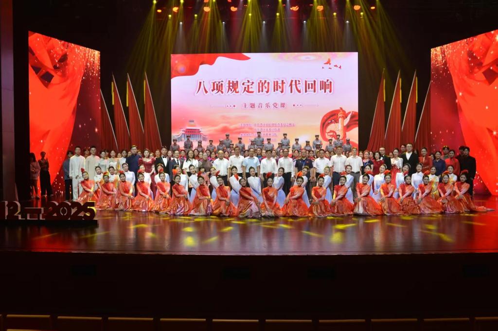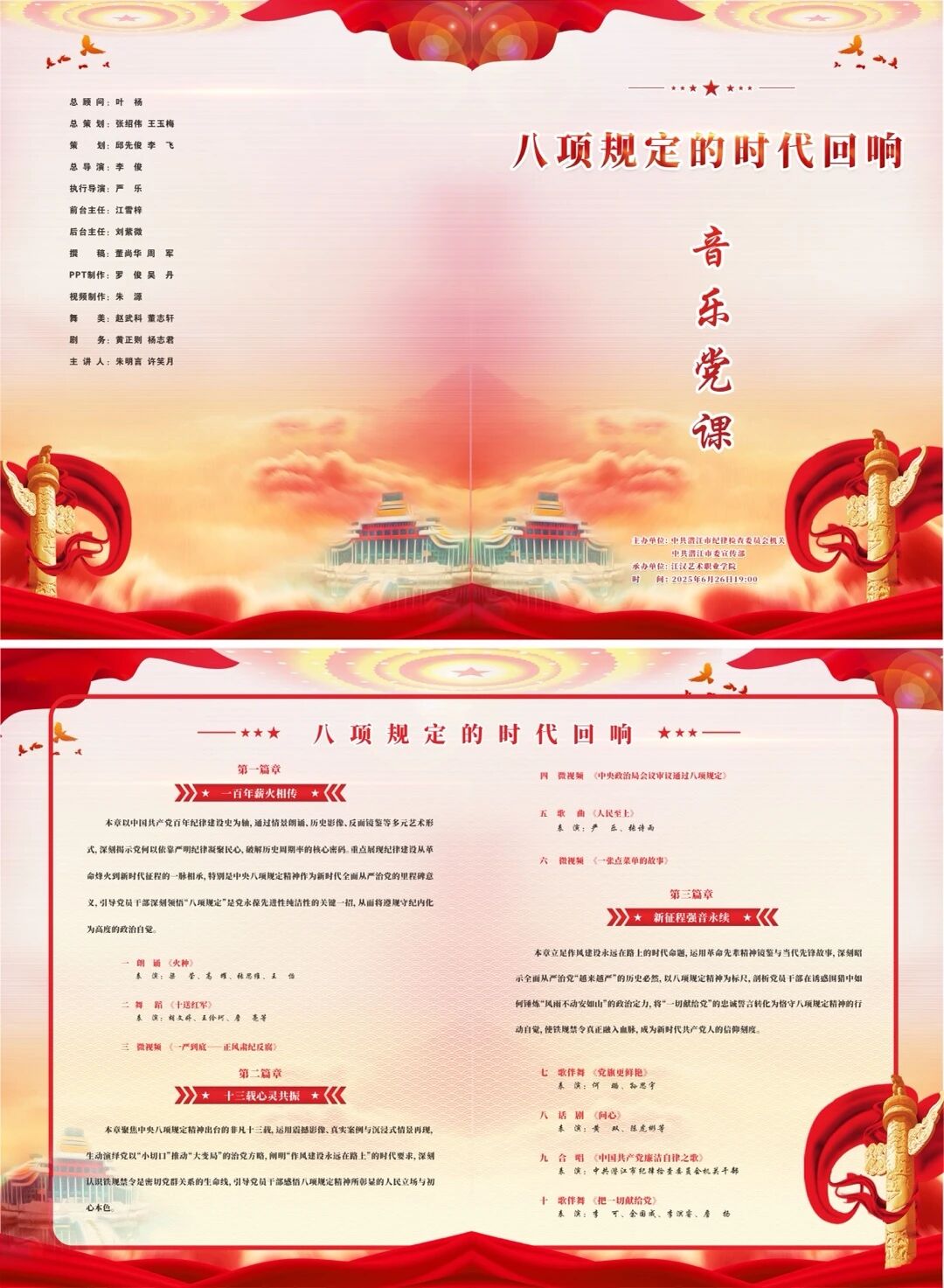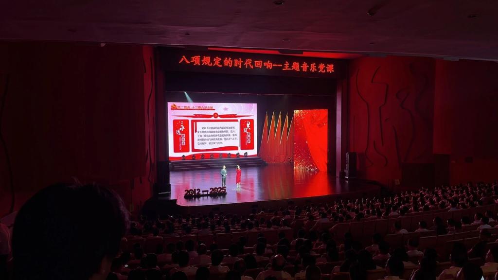 这堂“八项规定的时代回响”主题的音乐党课,近日在潜江市曹禺大剧院上演,本次音乐党课由潜江市纪律检查委员会机关、潜江市委宣传部主办,江汉艺术职业学院承办,共分为“一百年薪火相传”、“十三载心灵共振”、“新征程强音永续”三个篇章,由两位主讲人以微视频、PPT的形式,观众重温峥嵘岁月,带领全市1000多名党员干部、群众,重温党的历程、赓续红色血脉、坚定理想信念。一个多小时的党课中,有机融入歌曲、舞蹈、朗诵等多种艺术表现形式,加上李汉俊、钱瑛等富有潜江特色的元素,现场观众沉浸其中,热烈的掌声不时响起。