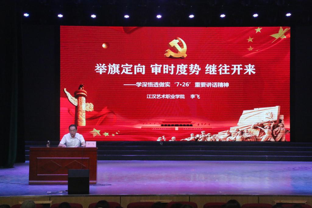 为深入学习领会习近平总书记7月26日在省部级主要领导干部专题研讨班上的重要讲话精神,6日上午,党委书记李飞为全校教职工作题为《举旗定向 审时度势 继往开来》的专题辅导报告。