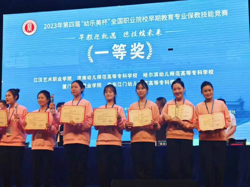 这是我校首届早教学生首次参加国赛,取得了骄人的成绩近日,学校早期教育专业于小岚、纪锦秋、屈亚欣三位同学在第四届全国职业院校早期教育专业保教技能竞赛中,凭借出色的表现,荣获团体一等奖。李小佳、唐俊如、周娟三位教师荣获优秀指导教师奖。