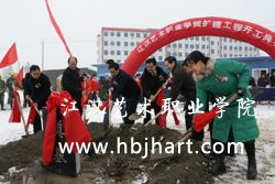 典礼由副市长戴明主持。江汉艺术职业学院院长杨文堂致欢迎辞,衷心感谢社会各界对学院建设与发展的关心支持。湖北省工业建筑总承包集团公司总经理郭庆春先生代表承建方郑重承诺,科学管理,精心施工,确保按期优质完成各项建设任务。园林办事处党委书记魏友元同志发言,表示积极支持学院的建设,为学院的扩建营造良好的社会环境。市委副书记、市纪委书记、市教育领导小组组长姜卫新同志讲话,要求有关部门和单位高度重视学院扩建工作,从大局出发,积极配合,全力支持学院的建设与发展,也希望承建单位确保质量、确保安全、确保工期。市委副书记、市长王敦胜同志宣布江汉艺术职业学院扩建工程开工。王敦胜、郭庆春、姜卫新、周开翼、刘祖寿、杨遥、戴明等领导同志为工程奠基。