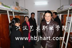 郭生练于29日下午来到江汉艺术职业学院,在学院院长杨文堂陪同下进行实地调研。他详细询问了学院教育教学和扩建工程情况,并深入到学生宿舍、学生食堂实地了解学生的生活情况。他希望学院抓住国家大力职业教育发展的大好机遇,加大建设力度,加快发展步伐;同时整治好校园内及周边环境,确保校园美化和师生安全。