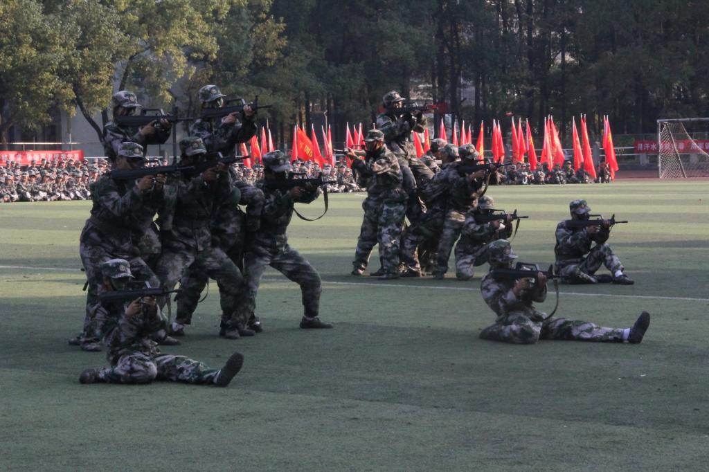 军训会操的各项表演在田径场盛大开演,标兵就位,队列整齐划一、充满朝气;分列式表演,各方阵步伐一致,精神抖擞;拳术表演中,新生们动作刚劲有力,充满了青春活力;女子方阵迎面走来,步履铿锵,英姿飒爽;特色展示中,新生们通过各种形式,展示了他们的向上风貌;手语表演以其无声的语言传达了浓烈的家国之情;校园文化创新方阵和战术方阵的表演,造型多样,精彩纷呈。