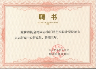 潜江市历史文化研究中心研究员杨金德,受聘成为江职地方史志研究中心研究员。