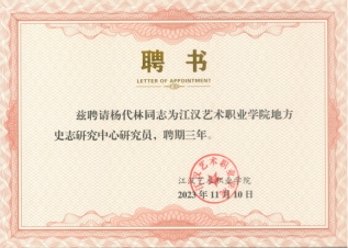 潜江市文旅局《文旅潜江》主编杨代林,受聘成为江职地方史志研究中心研究员。