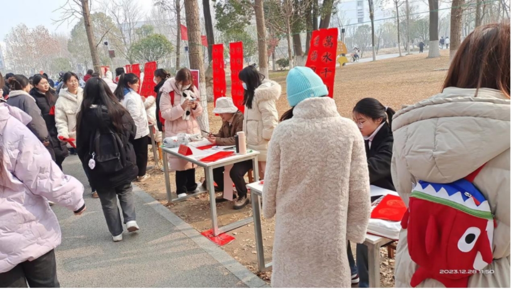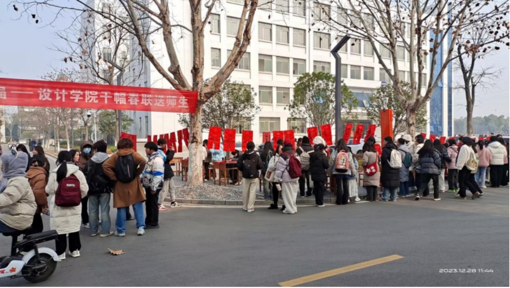 近日,为营造欢乐祥和的节日氛围,丰富师生精神文化生活,弘扬中华优秀传统文化,推动校园文化建设,设计学院组织2022级美术教育专业30余名学生,在学校东区银杏林、丰怡楼、图书馆同时开展了“写春联送万福——千副春联送师生”活动。