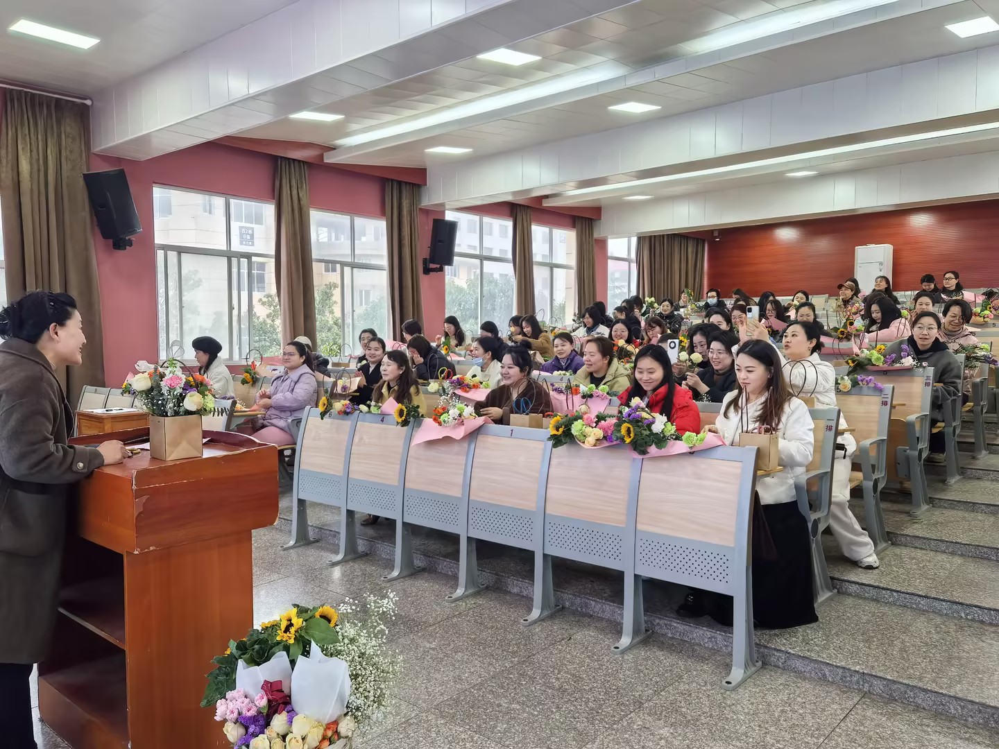 活动现场,摆满了各类鲜花。花艺老师详细讲解插花技巧,从花材选择、色彩搭配到造型设计,一步步耐心指导。教师们认真聆听,不时提出问题。