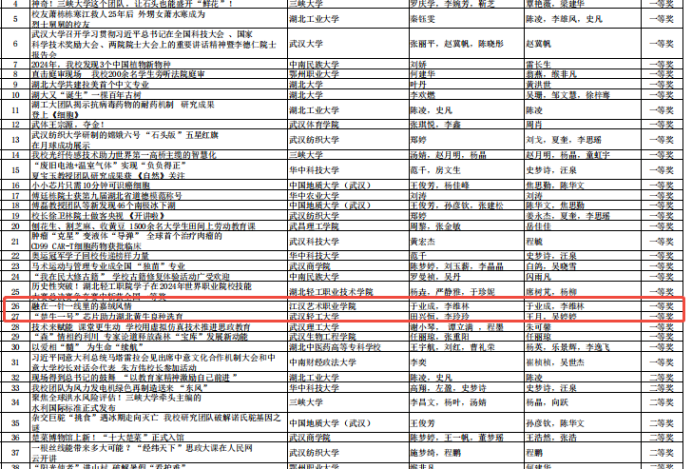 本网讯(通讯员 党宣李)近日,2024年度湖北高校新闻奖评选结果揭晓,学校首次参与评选,便斩获多个奖项,其中包括两项一等奖。获奖作品内容丰富,涵盖了实践教学、人才培养、创新创业、榜样人物及校园文化等多个领域。