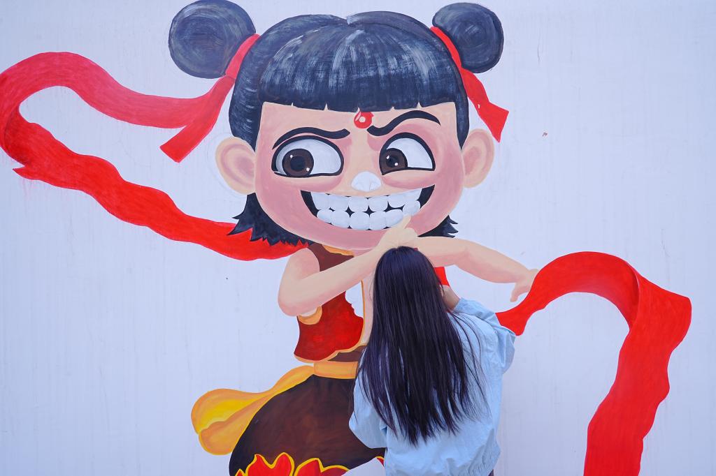 2023级美术教育专业学生陈晶晶一边仔细描绘着线条,一边笑着对记者说:“绘画的过程也是学习的过程,看到成品的时候,非常开心。能通过自己的画笔为创文贡献一份力量,感觉特别有意义。” 此次墙绘活动是该院设计学院78名学子的实践课程,课程以哪吒的四个版本为主题,将在200米长的围墙上,分成10组,完成50幅作品。