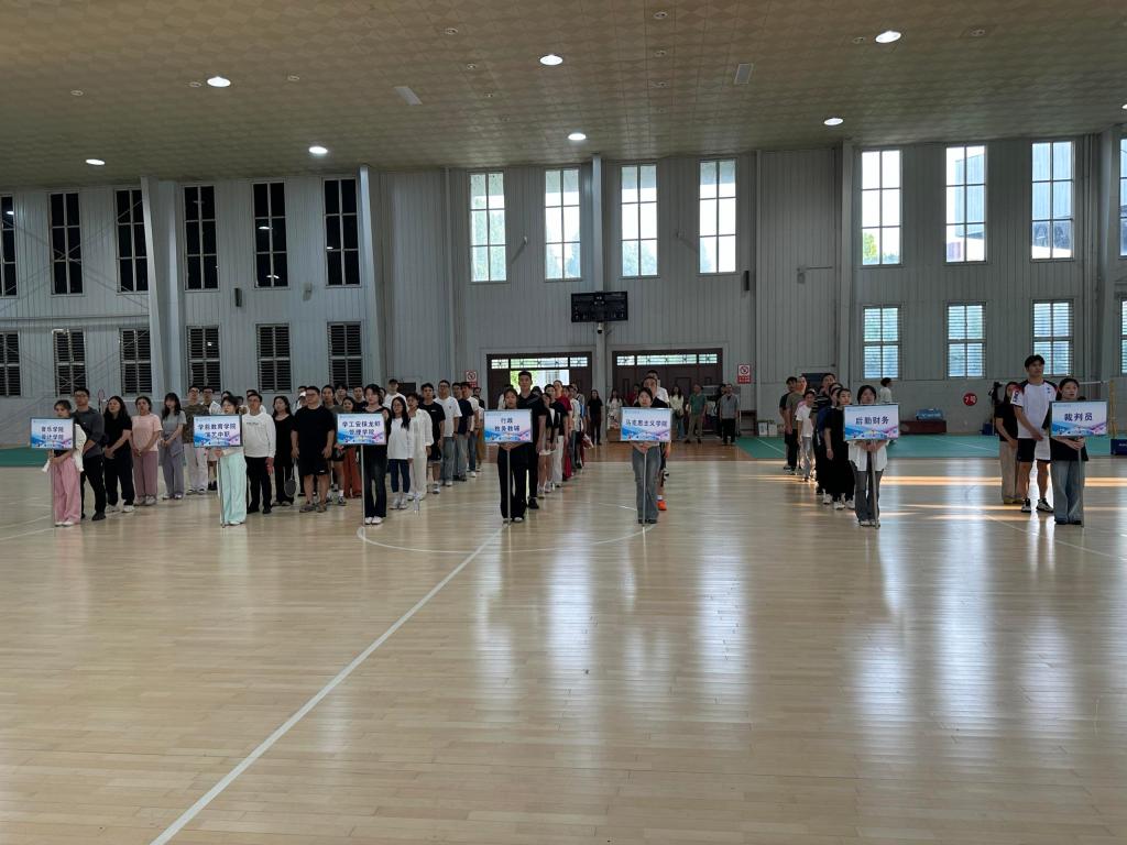由各分工会组成的12支代表队身着统一运动服,迈着整齐步伐依次入场。裁判员方队紧随其后,展现出专业严谨的精神风貌。作为开幕式的亮点环节,校羽毛球校队带来了一场别开生面的韵律操表演。队员们手持球拍,以充满活力的舞蹈动作将羽毛球运动与艺术表演相结合,在动感的音乐节奏中展现了力与美的完美融合,赢得现场观众阵阵掌声。