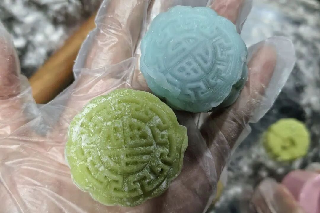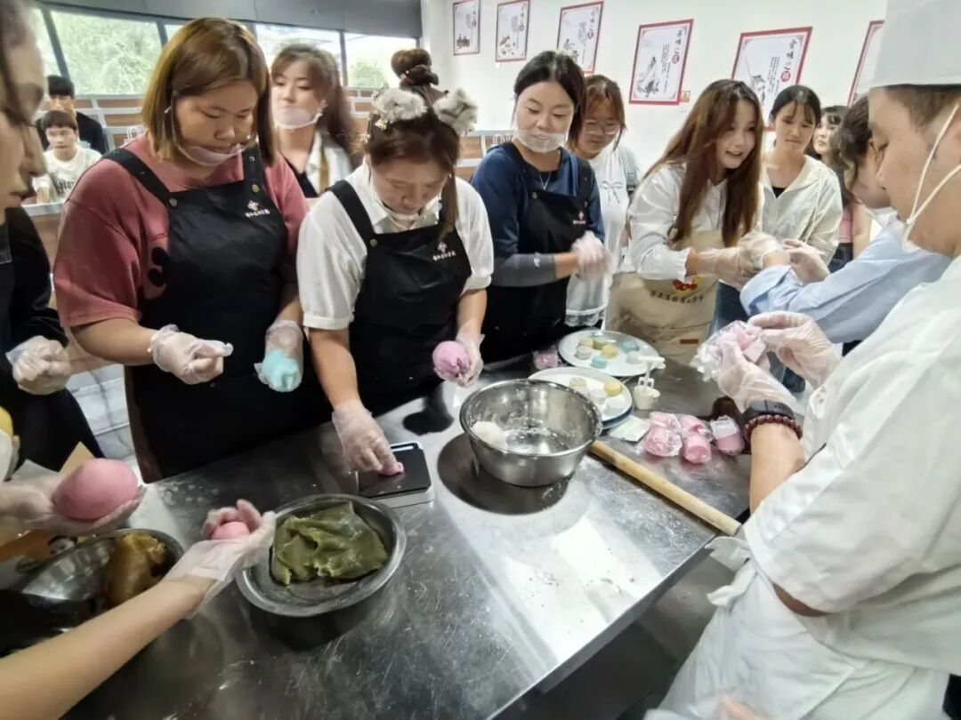 座谈会后,同学们移步烹饪演示阶梯教室,参加月饼制作体验活动。在专业烹饪教师的指导下,同学们纷纷化身“校园糕点师”,兴致盎然地称重、和面、包馅、压模。专注的眼神、协作的身影与欢快的笑声交织在一起。
