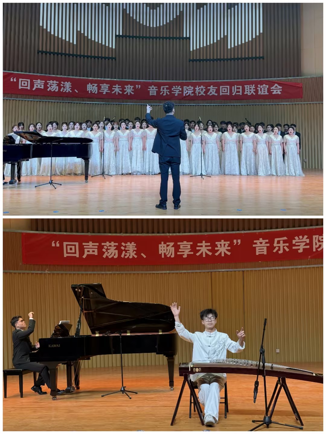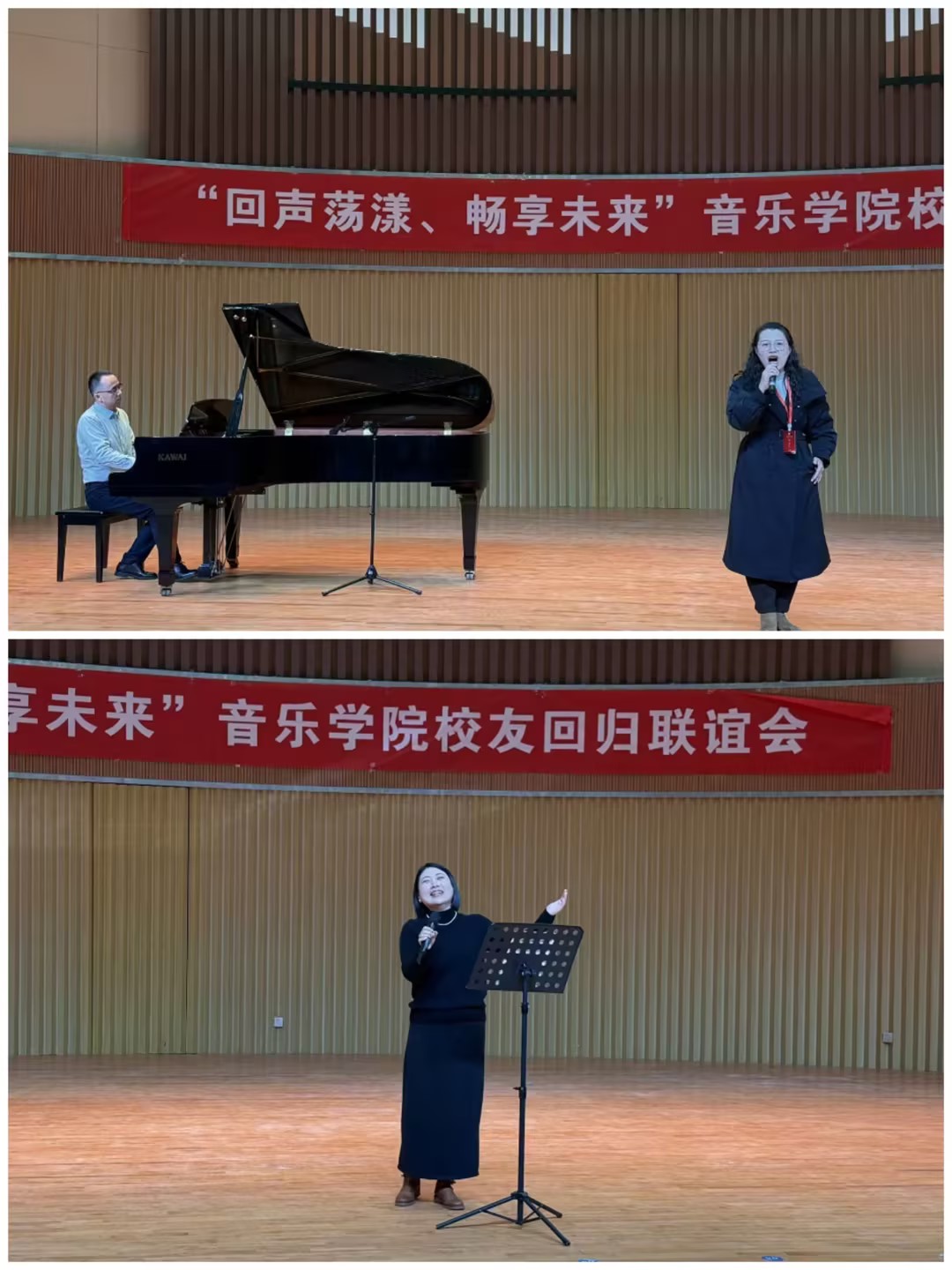 音乐会由学院管乐团、合唱团与民乐团联袂呈现,演绎了一段段承载记忆与憧憬的动人旋律。2000级校友谢蓉深情演唱《沂蒙山永远的爹娘》,情真意切,感染全场;2001级校友陈婧倾情献唱《我家就在长江边》,歌声悠扬,饱含乡情。在林晓波老师的钢琴伴奏下,演出氛围温馨而热烈,将校友与在校学子同台辉映的场景推向高潮,生动展现了学院艺术教育的扎实传承与代代相续的育人精神。