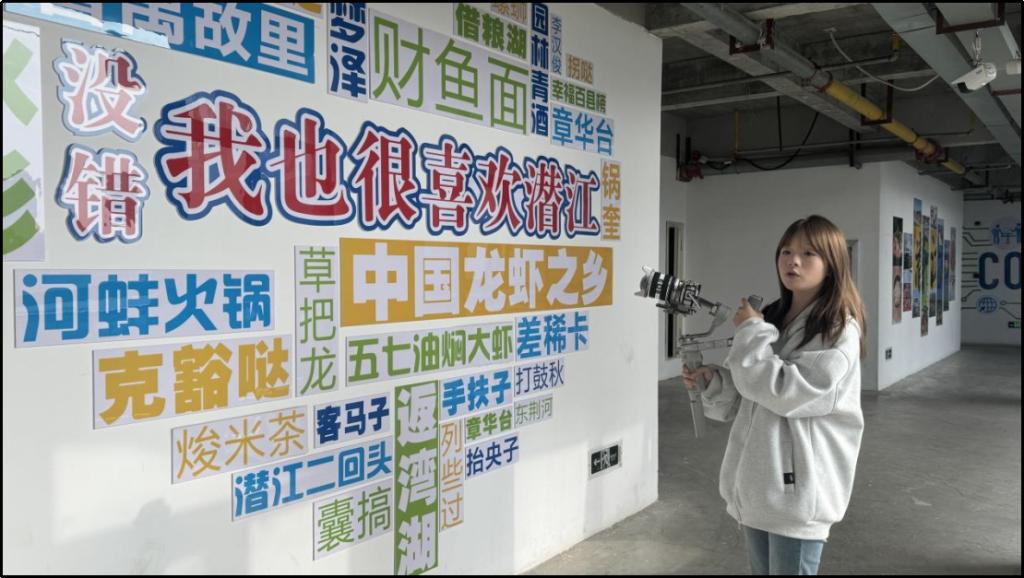 “家人们,点击左下角链接,99 元就能解锁曹禺公园 + 西西花园农场双人一日游,还包含景区讲解和往返交通!” 本地生活直播区,24级网络直播与运营学生佘紫彤手持云台边走边播,镜头扫过精心布置的潜江文旅展示墙,墙上的民宿照片、美食实物与直播画面实时联动。佘紫彤熟练把控讲解节奏,既娓娓道来景点的历史渊源,又清晰拆解套餐的使用规则,实时回应观众关于“预约时效”“退款政策”的消费疑问。一旁的运营团队同步监控弹幕互动,调整推广话术,后台核销订单持续增长。
