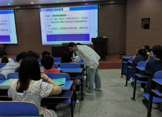 刘濛老师从情绪管理的重要性出发,与学生共同探讨情绪管理的方法和策略,并进行现场练习,帮助学生进一步了解和学习情绪管理的方法:包括测量情绪脉搏、打开情绪箱子、写情绪日记等。