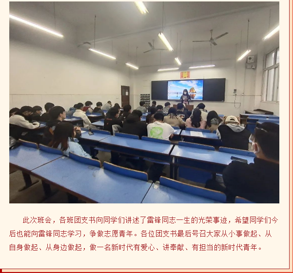 管理学院积极响应学校号召,在全院组织召开三月学雷锋月主题班会。班会由各班团支书主持。同学们通过观看影视资料进一步了解雷锋的先进事迹,认真讨论什么是雷锋精神、新时代的大学生应该如何发扬雷锋精神。