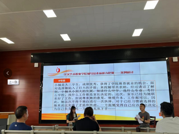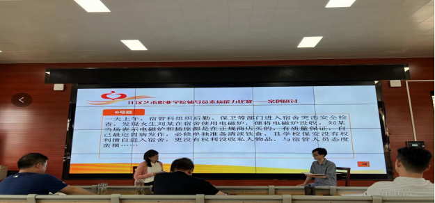 决赛“案例研讨”环节,以每组两位选手通过“我提问,你回答”的问答研讨形式,紧扣辅导员工作中思想政治教育、日常管理、价值引领、学风建设等领域的典型案例展开。主要考察辅导员思考问题、分析问题、研判问题、解决问题以及理论学习应用能力。参加决赛的10名选手,结合案例情境,就辅导员工作中涉及的理想信念教育和价值引领、学风建设、危机事件应对与处理、稳定安全教育管理、学业指导、就业指导、党团班级建设等各类工作内容,辨析原因、探讨对策、总结规律。参赛的辅导员老师们既是对手、又要联手,既要出招、也要接招。