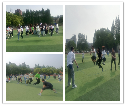 四个小队分别选出各自的队长,合作起队名、设计队标、排列队形、商定口号,并进行展示。有的小队队名新颖好记,有的口号押韵响亮,有的队标别致,有的队形独特。随后,各小队进行了连续项目“一圈到底”“袋鼠跳接力”“珠行万里”“两人三足”“心心相印”“多人跳绳”“彩虹冲刺”等项目。