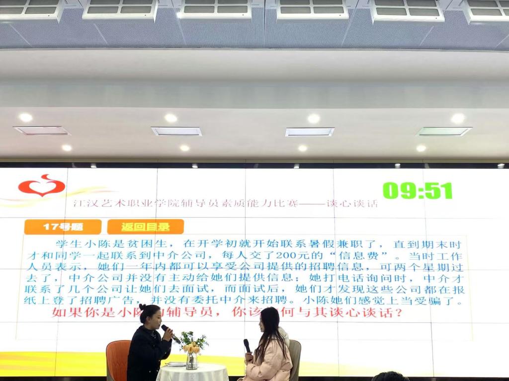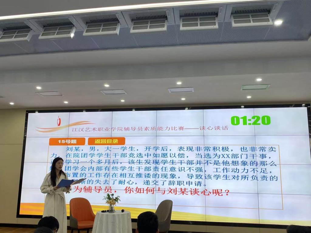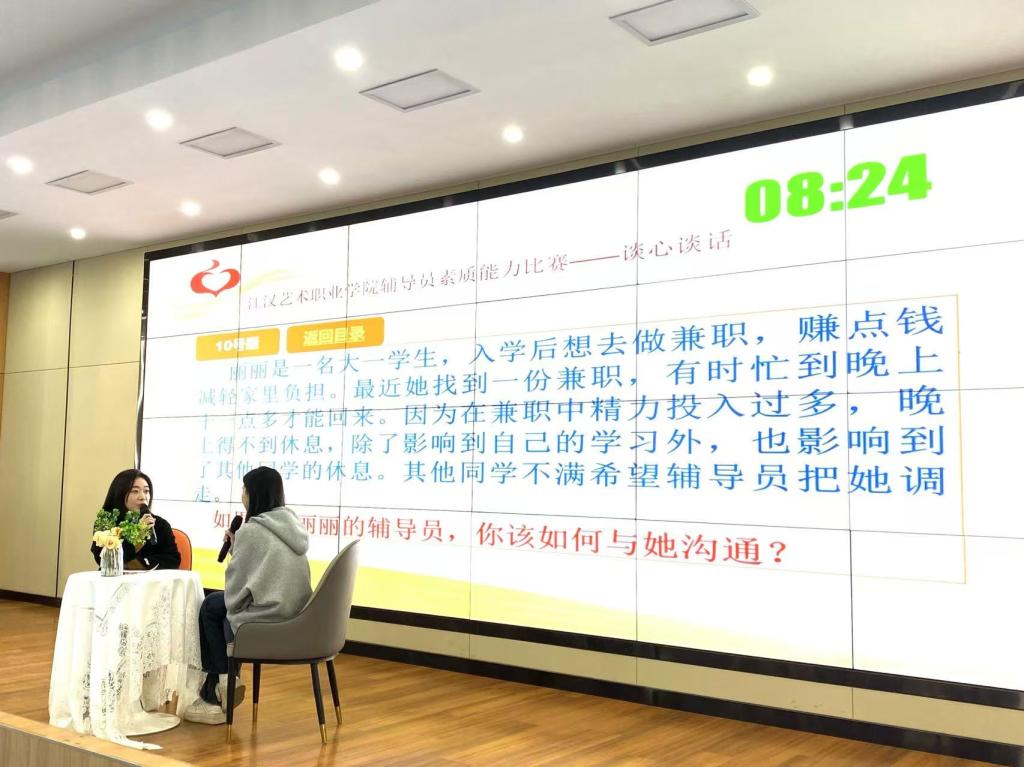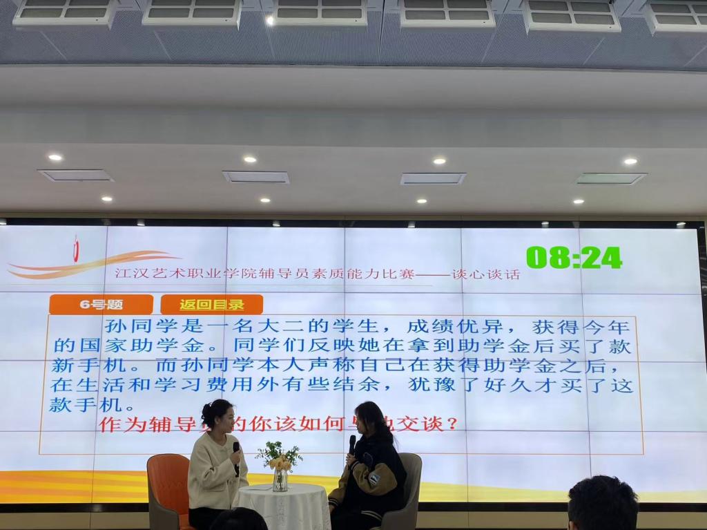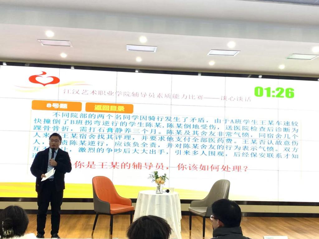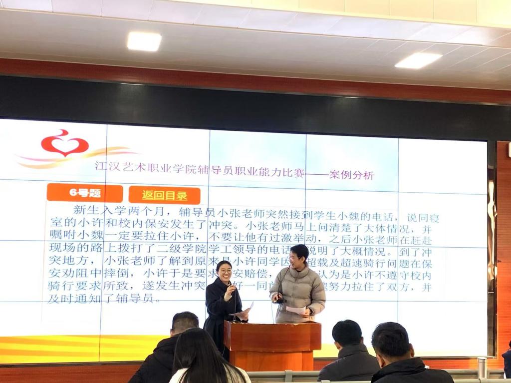 为深入学习贯彻习近平新时代中国特色社会主义思想,全面贯彻落实党的二十大精神,落实立德树人根本任务,不断提升辅导员理论水平、职业能力和专业素养,充分展示辅导员以生为本、潜心育人的优秀品质和育人实效。江汉艺术职业学院于12月17日、18日连续两天分别在综合楼200和5号报告厅进行辅导员素质能力大赛决赛项目——案例研讨与谈心谈话。江汉艺术职业学院党委委员周剑波、学工部部长杨林、副部长张明明、刘濛及学工部全体成员、各院部学工领导、全体专兼职辅导员现场观摩了决赛。