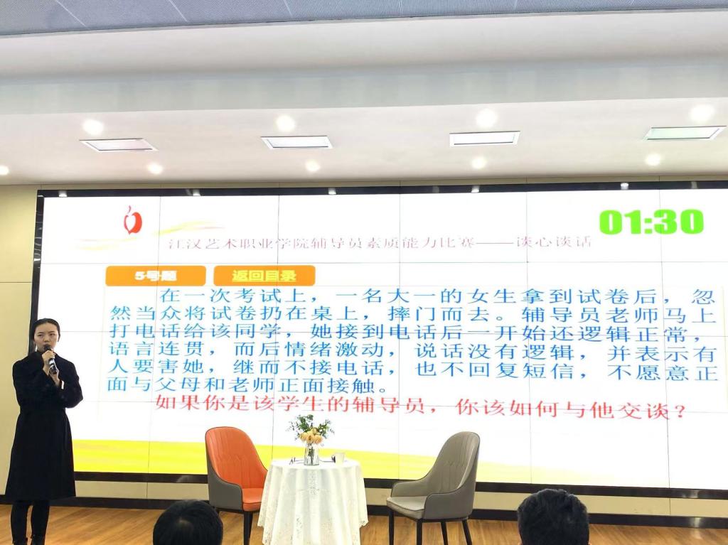 “谈心谈话”环节,主要考察辅导员对学生特征、学生成长成才规律的了解把握程度,对学生的教育引导能力、解决理论困惑和实际问题的能力等。参赛选手提前十分钟抽题,模拟真实场景,与提问学生开展谈心谈话。谈话结束后,选手需结合谈话情况进行简短总结,分析存在问题与改进措施,并回答评委提出的问题。