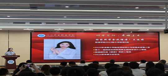 获奖学生代表满怀激情,汇报了他们在江职的学习成长与收获。他们有的代表学校参加国家级、省级大赛,为学校增光添彩;有的是学生会团委成员,积极服务学校的教育教学管理工作,为学校发展建言献策;有的是热心公益富有爱心与创新精神的志愿者。在场学生认真倾听获奖者发言,为他们用勤奋与汗水书写的瑰丽青春感动,为身边零距离同龄榜样的精神振奋。