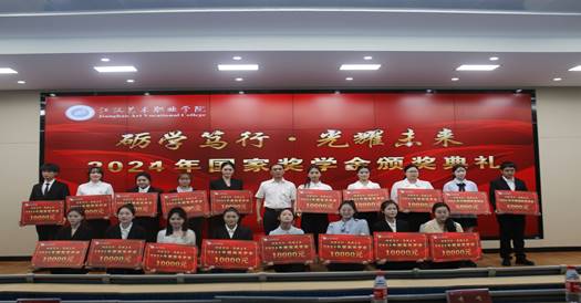 副校长廖江涛、纪检书记黄超为国家励志奖学金获奖学生,党委书记李飞为国家奖学金获奖学生颁奖。