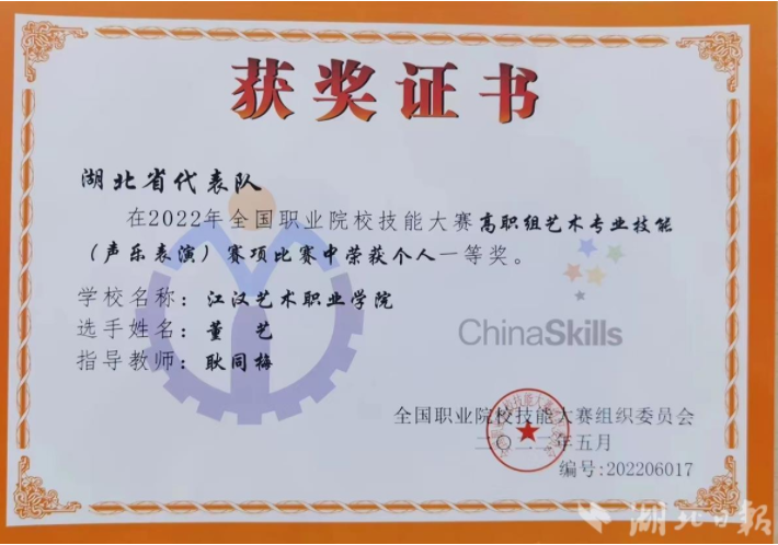 这是江汉艺术职业学院第二次斩获全国职业院校技能大赛高职组声乐表演赛项一等奖,也是该校在全国职业院校技能大赛中收获的第四个一等奖。