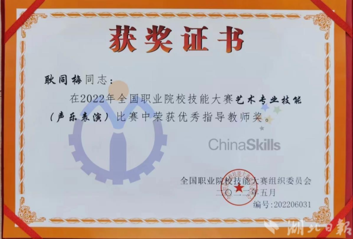 8月15日,2022年全国职业院校技能大赛高职组艺术专业技能(声乐表演)赛项圆满落幕。江汉艺术职业学院音乐学院学生董艺荣获一等奖,耿同梅教授获优秀指导教师称号。