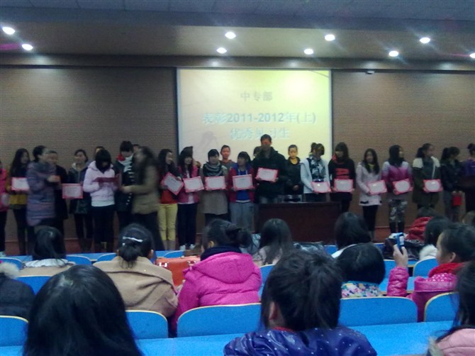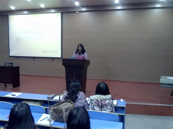 大会第一项:对2011——2012学年度上学期优秀见习生进行表彰,09、10届每班各有优秀见习生4名,由张主任、邹主任、杨主任分别为优秀见习生颁奖。