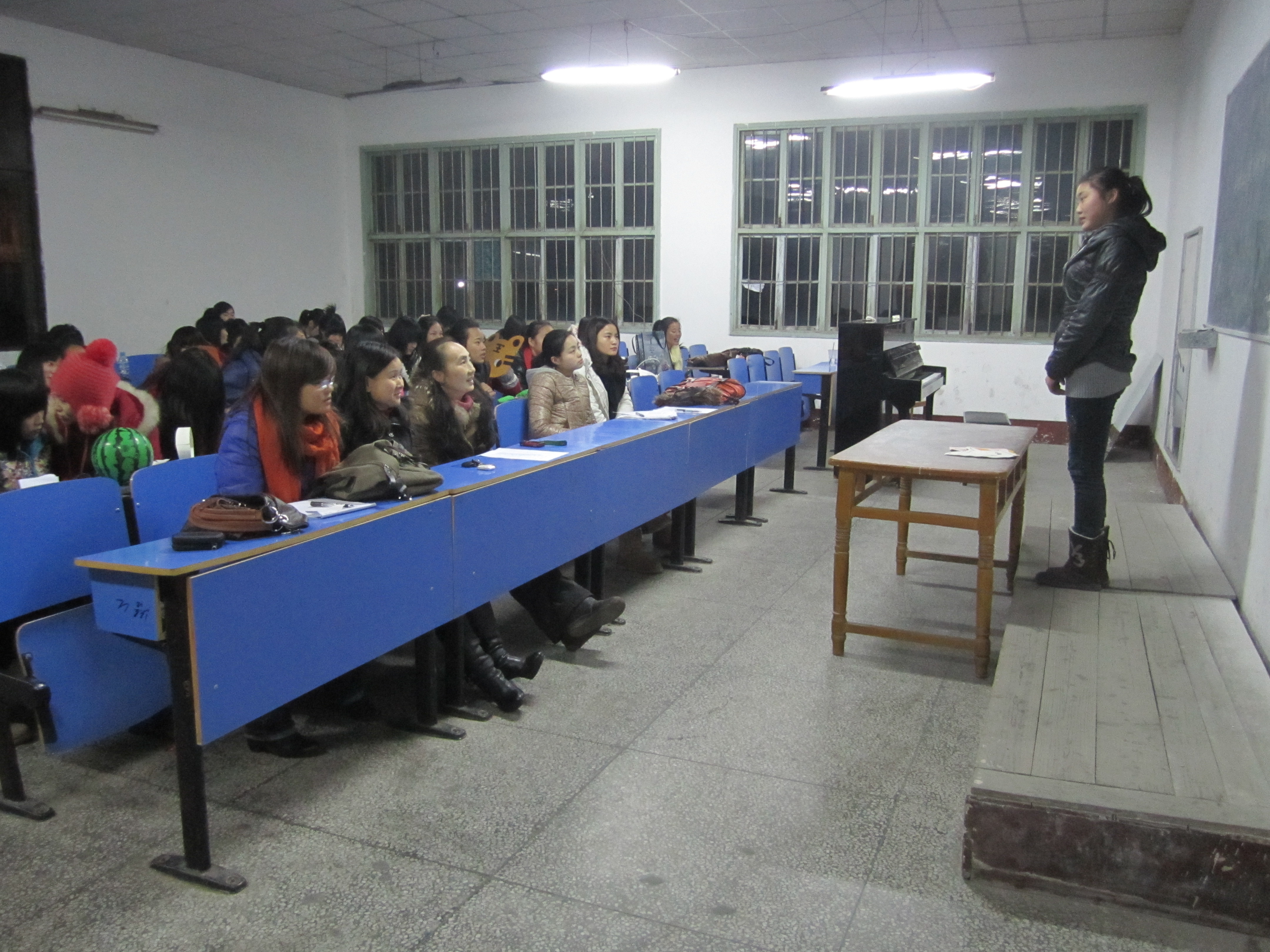 0901班作为毕业班,在校的学习已经结束,下学期即走向实习岗位,为了检验他们的学习收获和作为下学期实习安排的重要依据,中专部利用12月26日至28日三个晚上在综合楼101教室对部分科目进行了单独、重点考核,包括声乐、钢琴、儿歌弹唱、幼儿舞蹈创编、手工、简笔画、儿童故事七门技能课。中专部张敏主任、邹蔚江副主任、王祖艳副主任、李璀老师、0901班班主任关红艳老师、专业教师及0901班全体学生到场进行观摩考试。