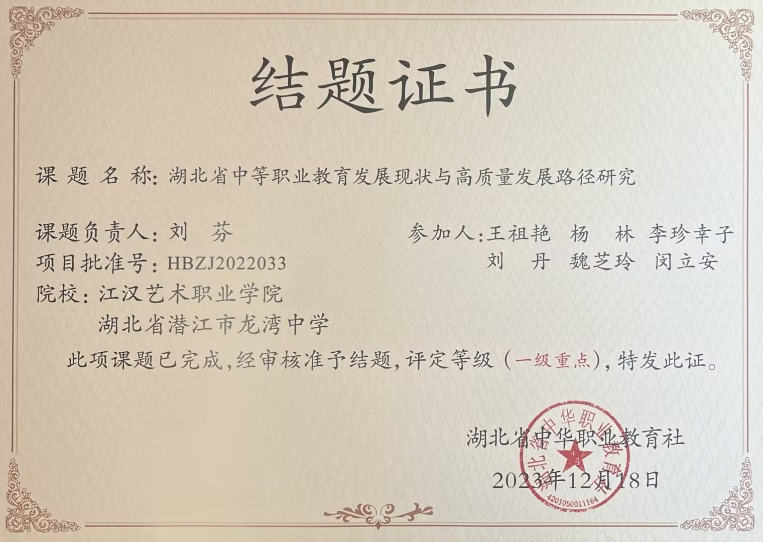 2023年12月18日,湖北省中华职教社2022年度立项课题《湖北省中等职业教育发展现状与高质量发展路径研究》顺利结题并被评为一级重点课题。该课题项目由中职部刘芬副教授主持,王祖艳、杨林、李珍幸子、刘丹、魏芝铃、闵立安六位副教授参与。该项目的研究促进我校教师自主进行教育教学改革,为湖北省中职教育高质量发展探索路径。