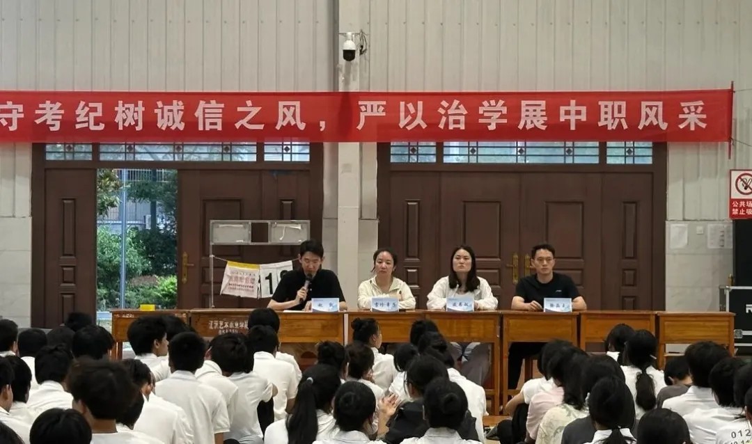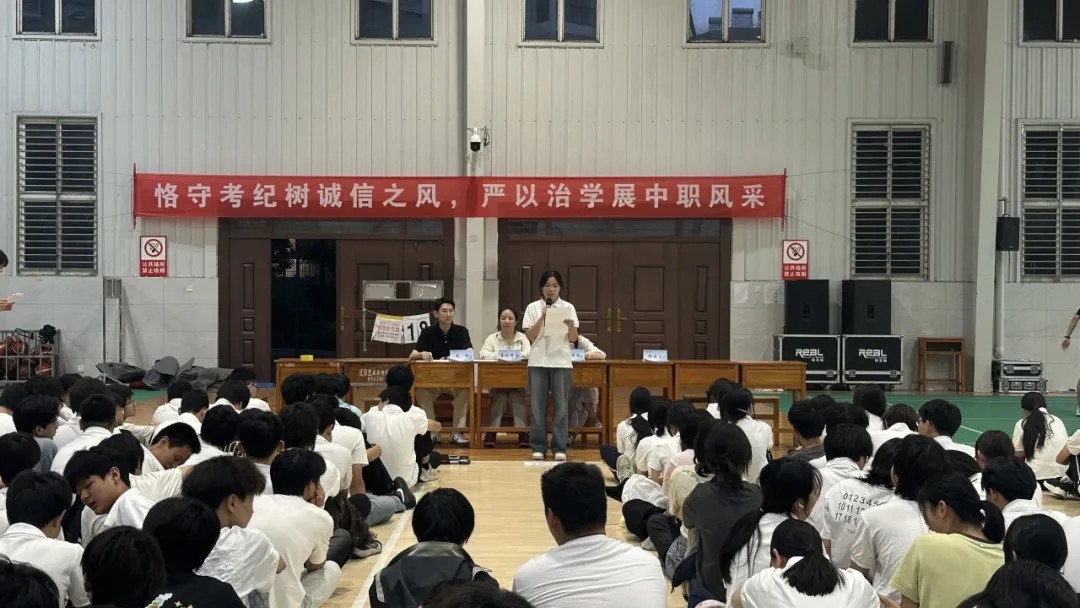 2025 年 6 月 9 日晚 7 点,江汉艺术职业学院中职部在体育馆召开 2024-2025 学年下学期第三次教育大会,聚焦安全教育、表彰、考试部署与纪律要求,为期末教学管理与学生安全保驾护航。