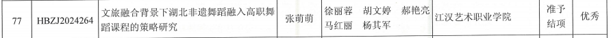 3. 课题编号HBZJ2024264《文旅融合背景下湖北非遗舞蹈融入高职舞蹈课程的策略研究》(负责人:张萌萌),成功结项并获评优秀课题。