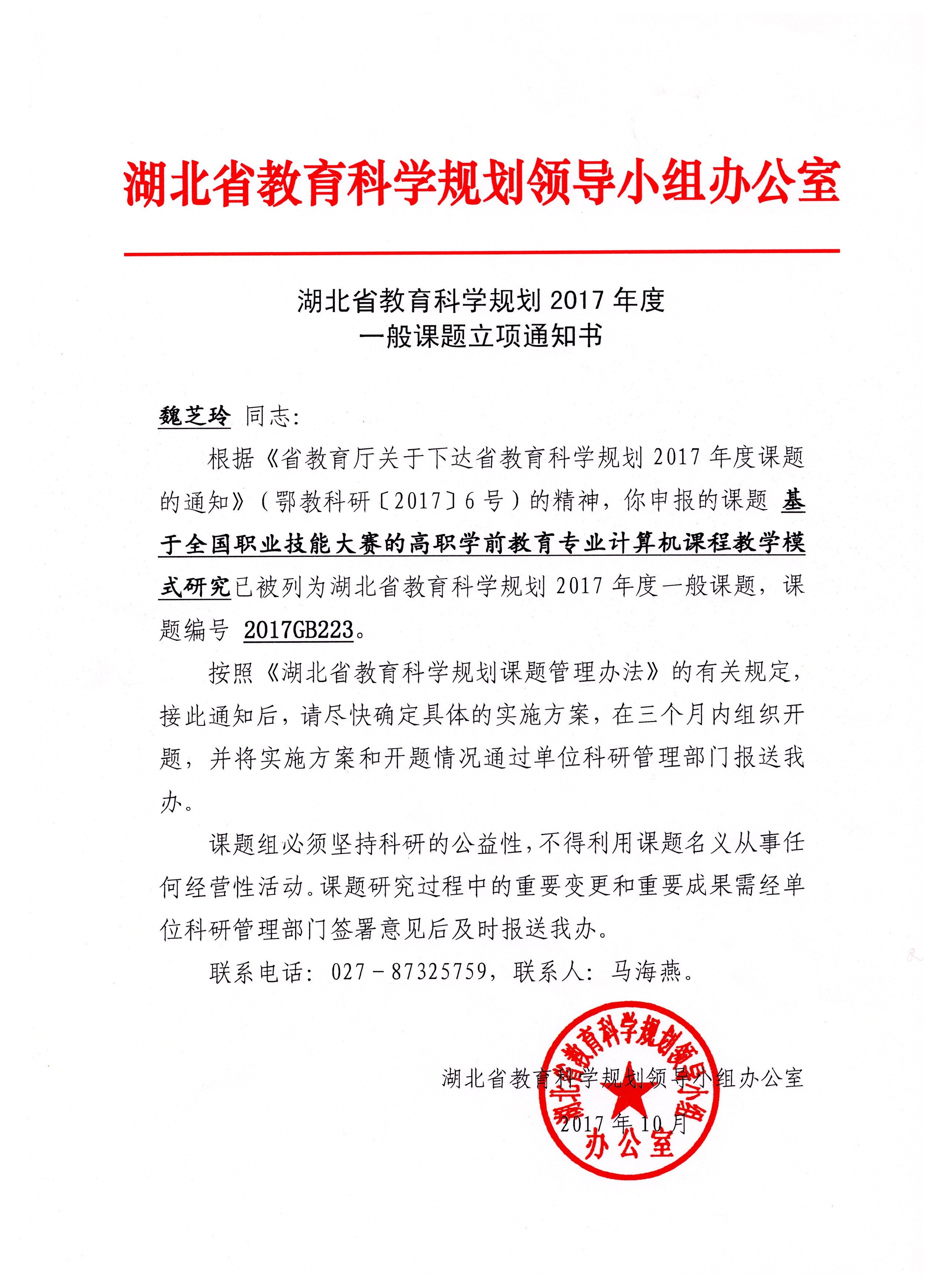 湖北省教育厅教育科学规划立项证书-魏芝玲