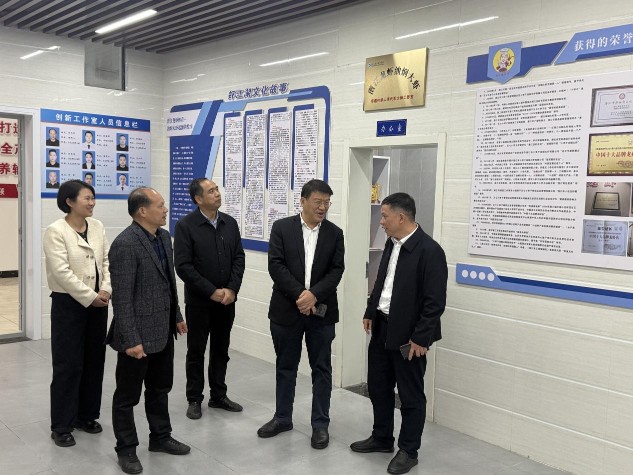 2025年11月14日下午,省总工会党组成员、副主席冯家欣一行莅临潜江,在潜江市人大常委会党组成员、副主任吴培军,潜江市总工会党组书记、常务副主席刘苗苗陪同下,赴潜江龙虾产业学院李代军大师工作室(非遗传承与劳模创新工作室,又称“小李子工作室”)开展视察指导。