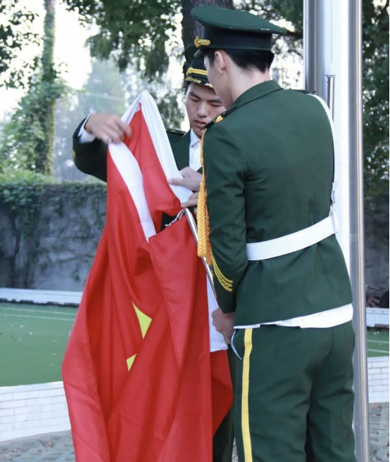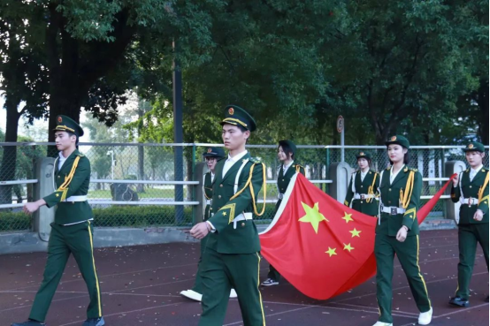 伴随着一声“升旗仪式正式开始”,国旗仪仗队的同学们迈着整齐划一、铿锵有力的步伐,护送着五星红旗正步走向旗杆。全体师生面向国旗肃立致礼,随着激昂的《义勇军进行曲》,师生们注视着五星红旗冉冉升起,在熠熠晨光中迎风飘扬。