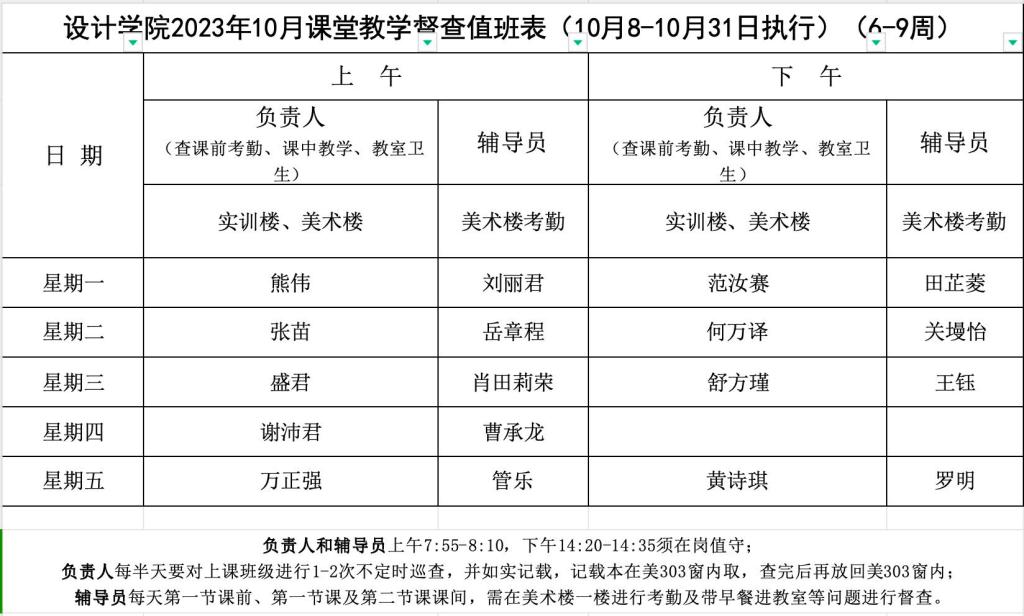 设计学院10月课堂教学督导值班表