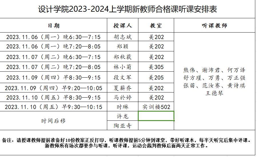 设计学院2023-2024上学期新教师培养合格课听课安排表