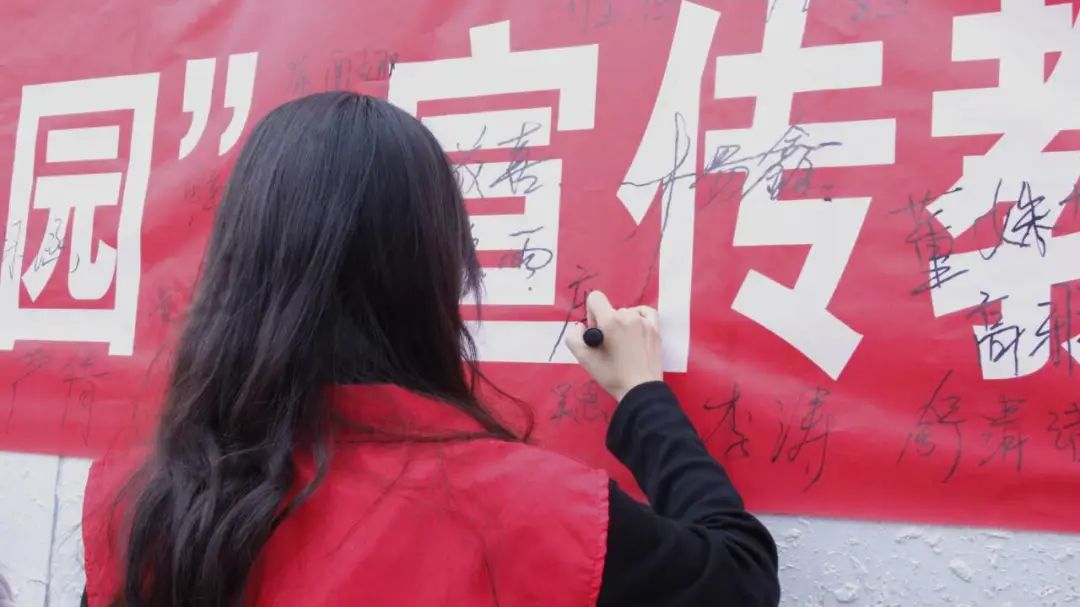志愿者张贴活动宣传,讲解防灾减灾知识,呼吁更多人参加这次活动,并了解相关知识。