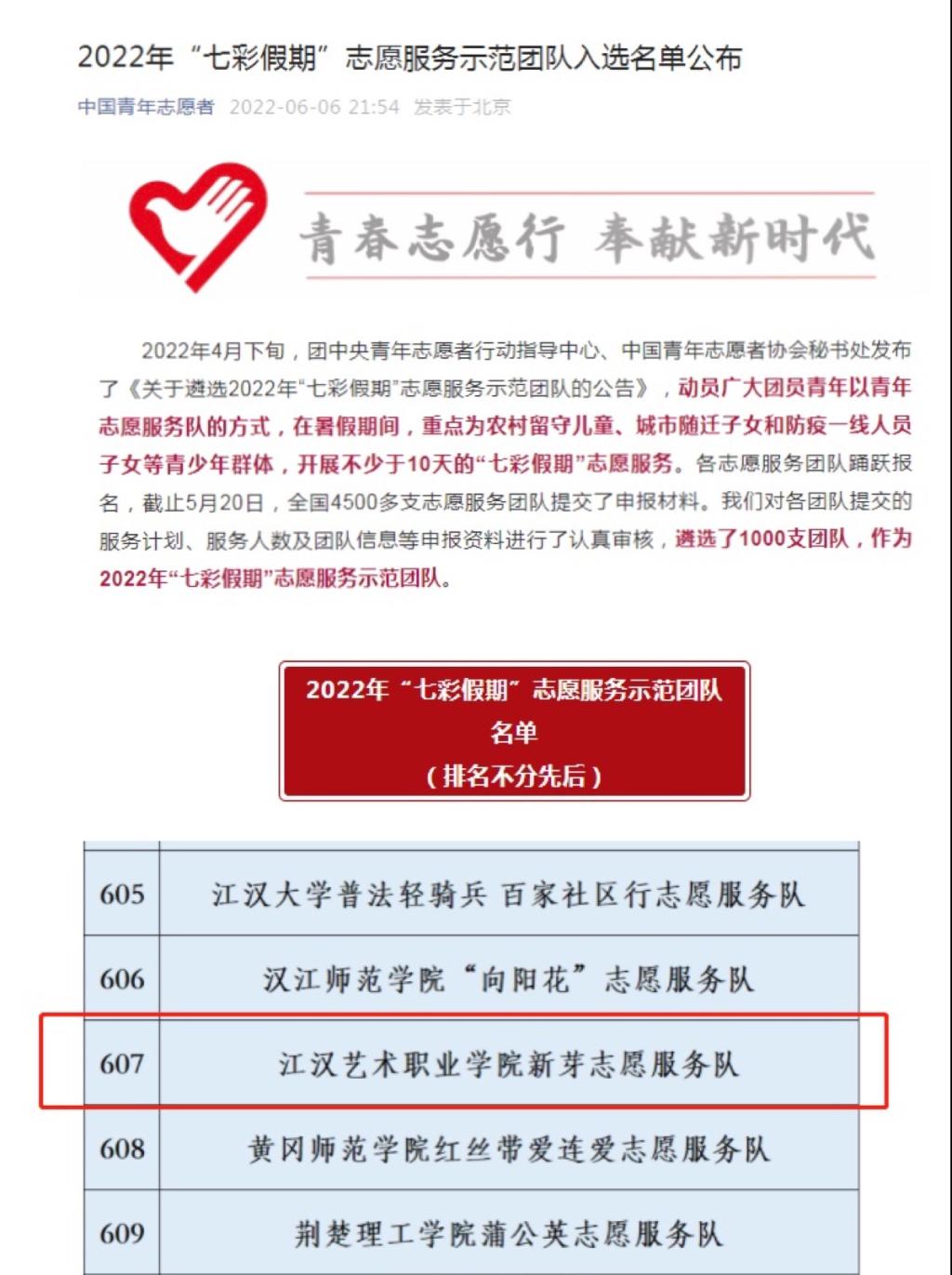2022年4月下旬,江汉艺术职业学院团委按照团中央青年志愿者行动指导中心、中国青年志愿者协会秘书处发布的《关于遴选2022年“七彩假期”志愿服务示范团队的公告》要求,动员广大团员青年利用暑假时间,重点为农村留守儿童、城市随迁子女和防疫一线人员子女等青少年群体,开展不少于10天的“七彩假期”志愿服务,在报名学生中选定10名志愿者组成新芽专项志愿服务队,最终在全国4500多支志愿服务队中脱颖而出,与武汉大学、华中科技大学、武汉理工大学等本科院校共同获批2022年全国“七彩假期”志愿服务示范团队。本次湖北省共88只队伍入选,其中高职类院校有11所。